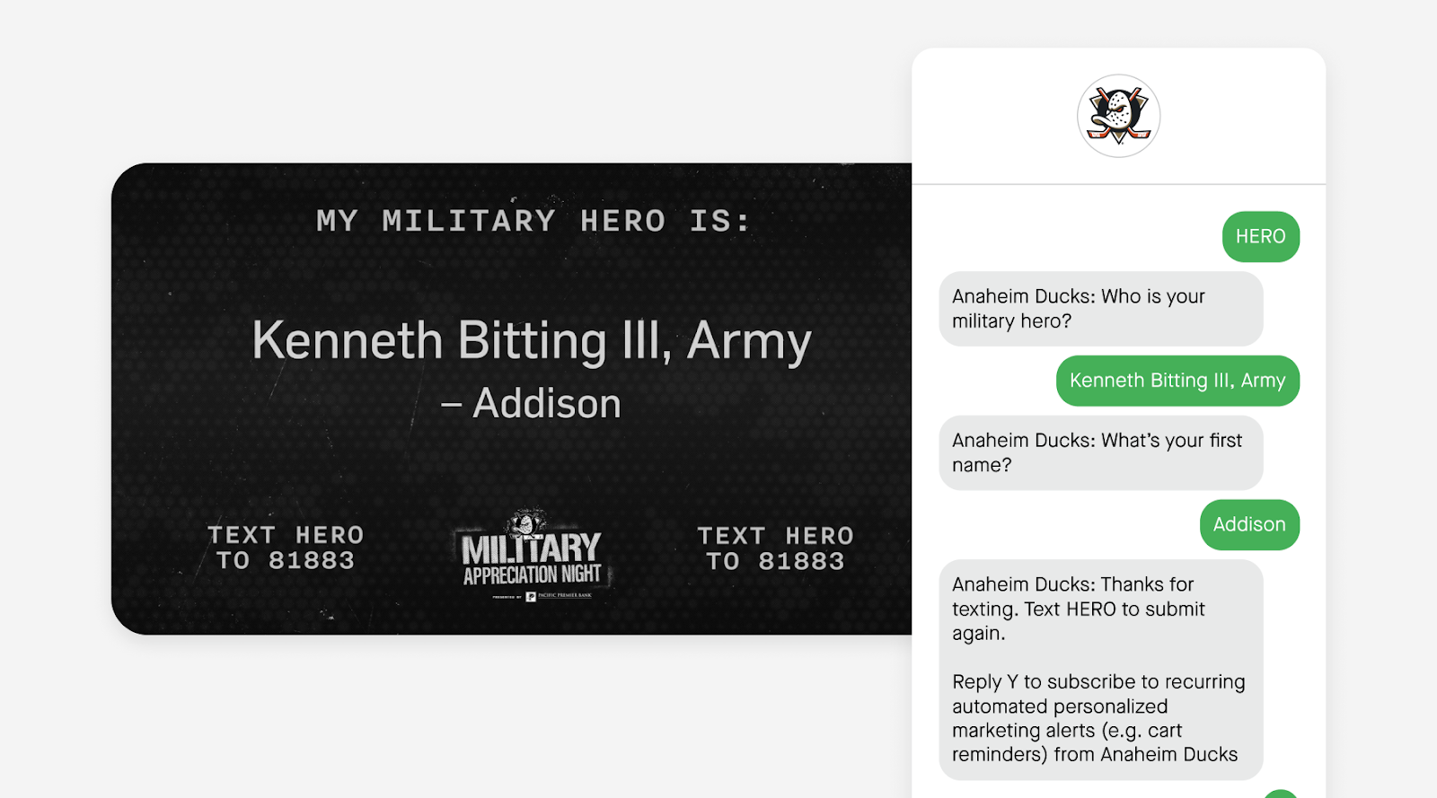 During a Military Appreciation Night, members of the audience could text in the name of a loved one whom they wanted to recognize and honor for their service. The names appeared on the jumbotron to applause from the crowd, helping to boost fan engagement and build their sense of community. In addition to the feel-good aspect, fans could sign up for continued SMS messages from the Ducks, helping them grow their list size to 25k subscribers.