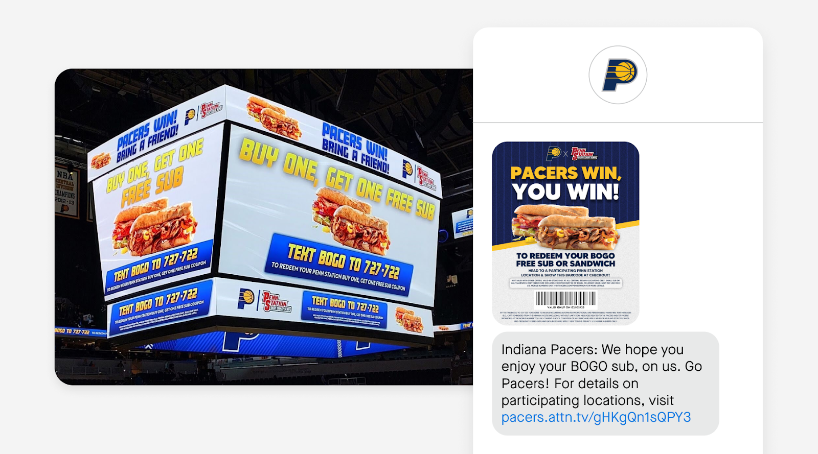 The Pacers’ approach to growing their SMS list has been a slam dunk. Every time they win a game, fans see a Buy One, Get One Free subs offer from Penn Station on the arena’s screens. To redeem it, they text “BOGO” and opt into the Pacers’ SMS program.