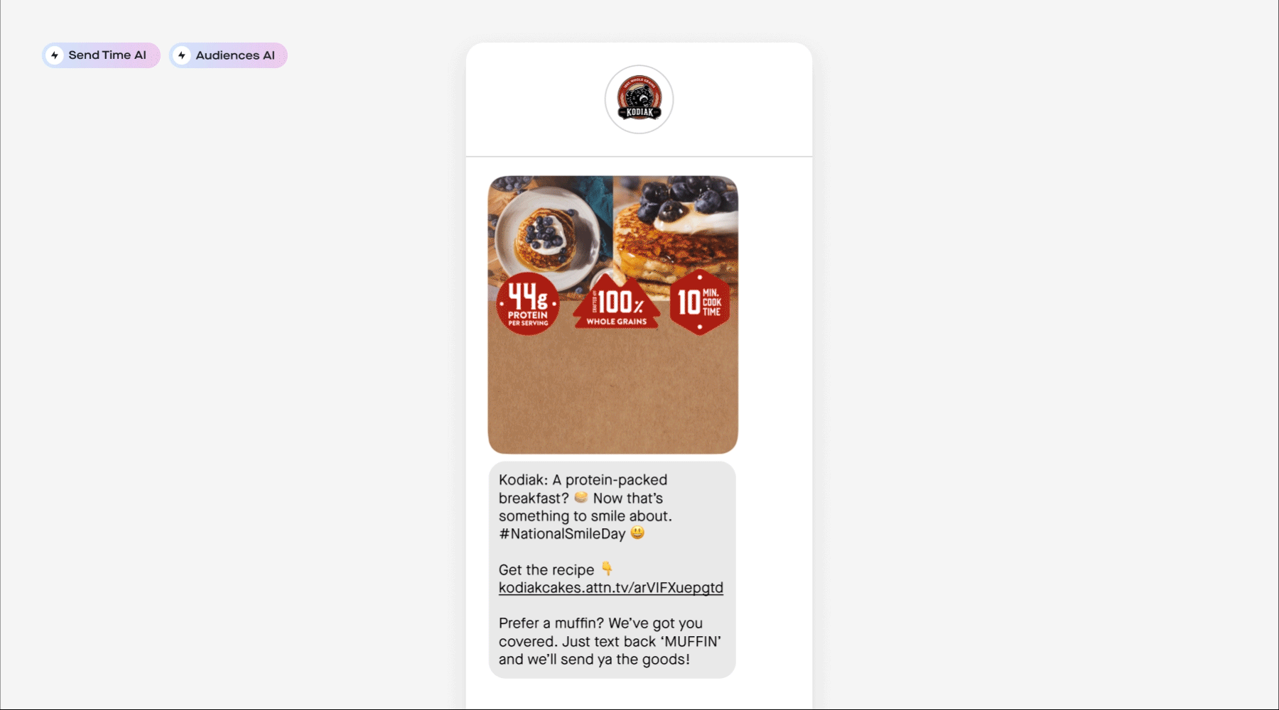Every campaign Kodiak sends is precisely crafted with the subscriber experience top of mind—customizing campaigns based on subscriber behavior, engagement history, and channel preference. They use Audiences AI to identify high-intent segments and Send Time AI to deliver each message when it’s most likely to be effective.