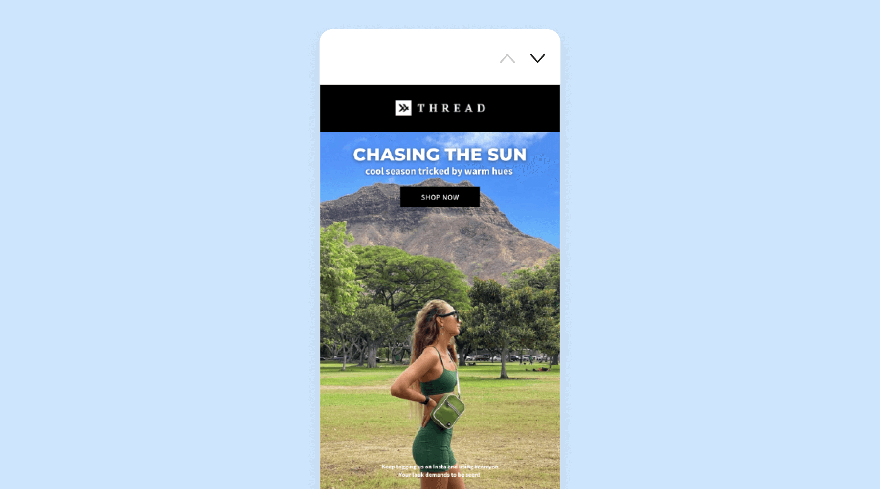 Thread Wallets celebrates their customers by featuring tagged Instagram posts in a monthly email. Not only is this beneficial for Thread Wallets to show their products in the real world, but it’s fun for their customers to see if their image was selected that month. This a fantastic opportunity to curate user-generated content by asking your followers to share pictures of your products on the road or at a game.