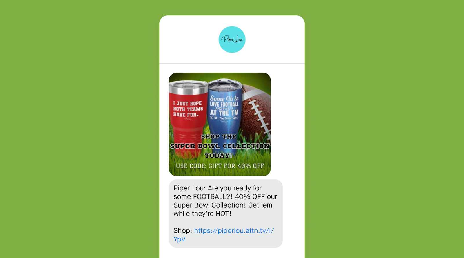 After promoting their football collections all-season, Piper Lou kicked off playoffs with a discount on their curated collection. With a subscriber audience full of engaged sports fans, SMS was the ideal channel to tap into the energy surrounding the event.