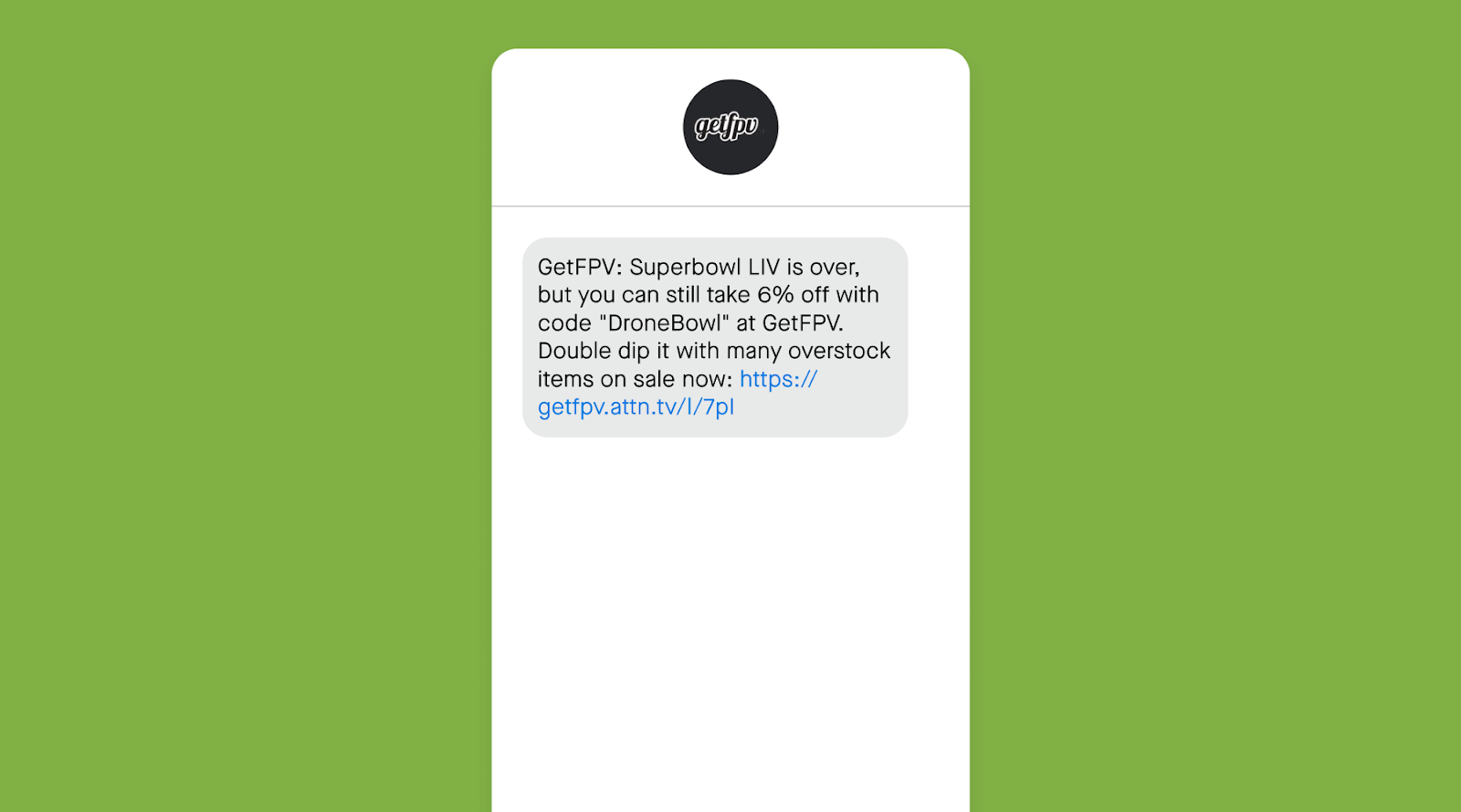 GetFPV—an online retailer for drones and related products—kept the party going with a post-game promotion of their “Drone Bowl” sale. As customers were on their phone decompressing from the day’s celebrations, this was the perfect opportunity to connect with their SMS audience and drive mobile revenue.