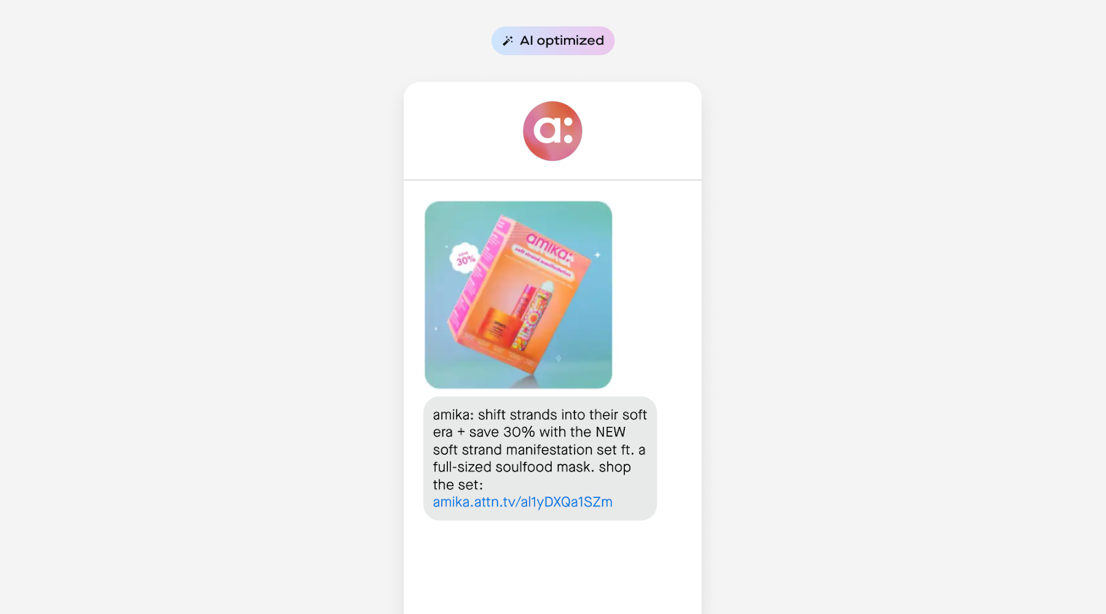 Where email educates and inspires, SMS delivers immediacy and connection. amika® is intentional about its SMS cadence, using the channel for moments that matter most—timely reminders, product drops, VIP access, and two-way engagement.