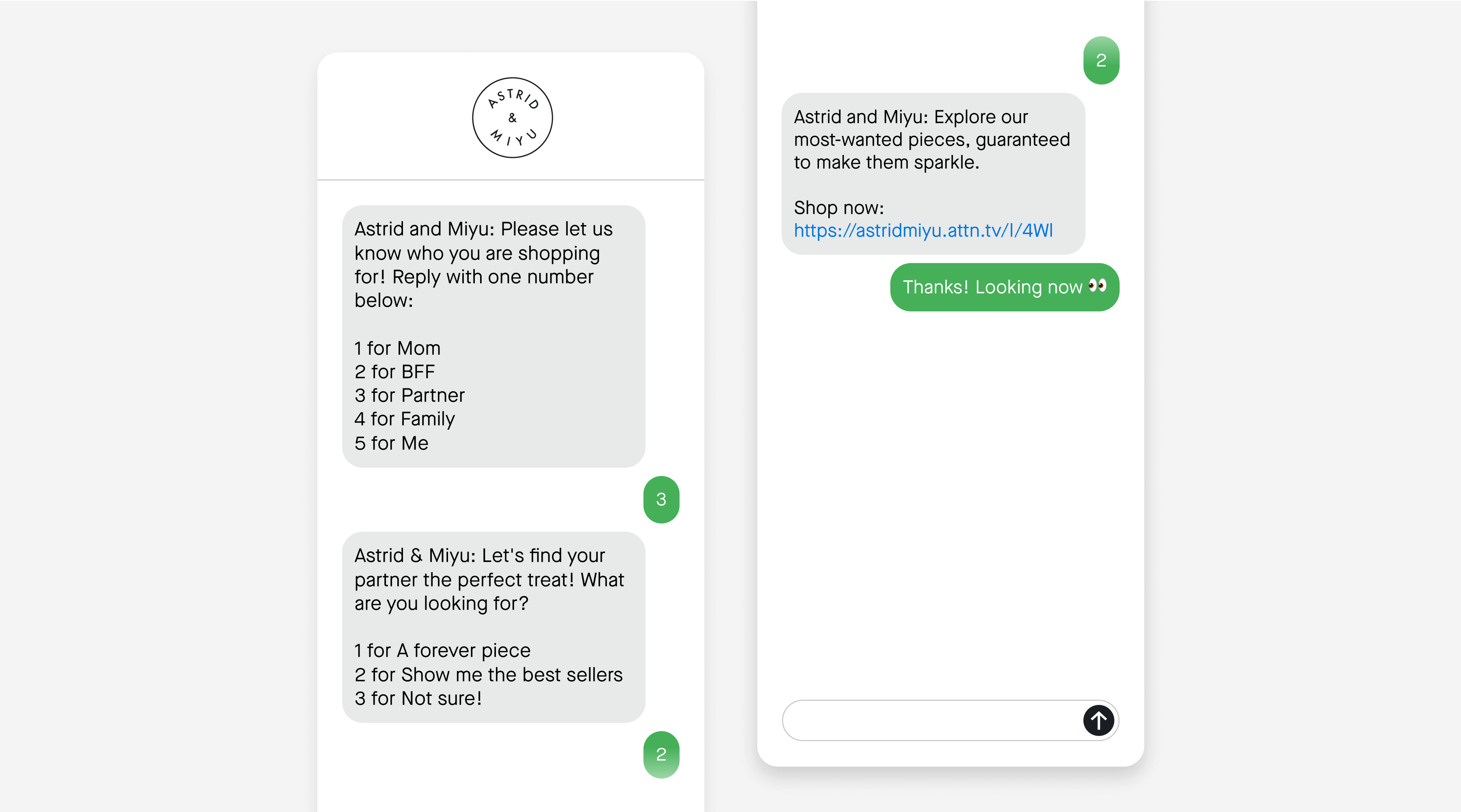 As part of their festive season campaign, Astrid & Miyu used Attentive’s Two-Way Journeys™ to ask subscribers about who they were shopping for via text message, prompting them to reply with a specific keyword. Each response triggered another message with a direct link to a collection.