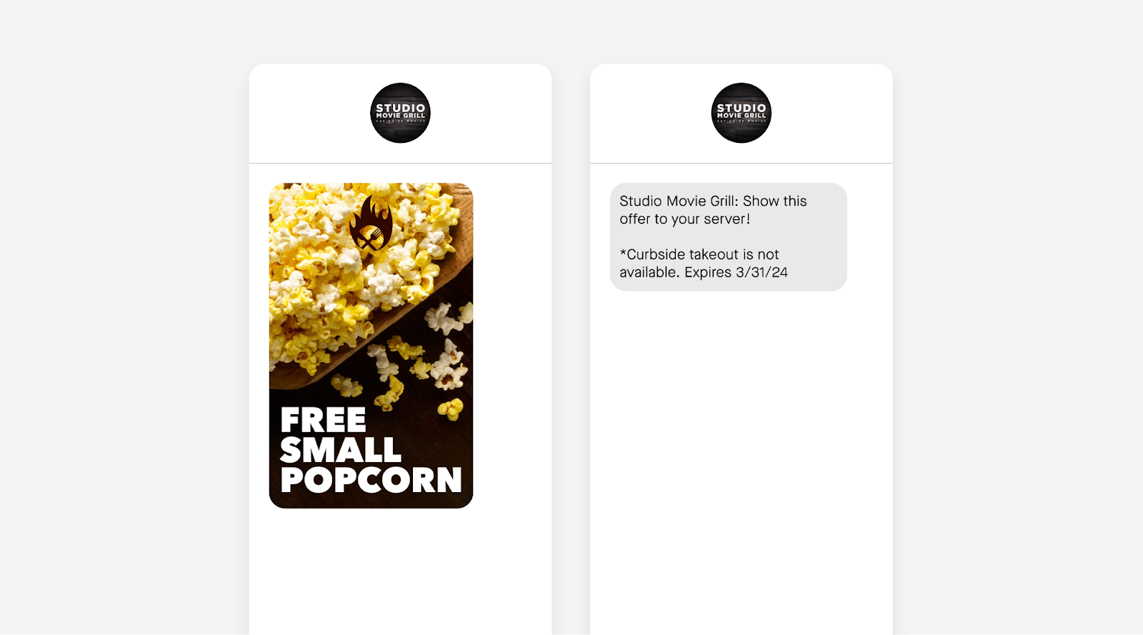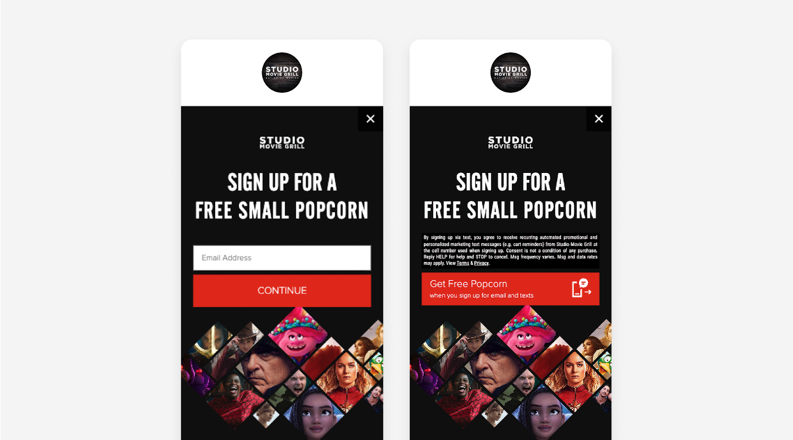 SMG uses a compelling incentive to encourage sign-ups: a complimentary small popcorn, which can be redeemed during the subscriber's next movie experience (making it the more attractive offer for customers who may be considering other theater options).
