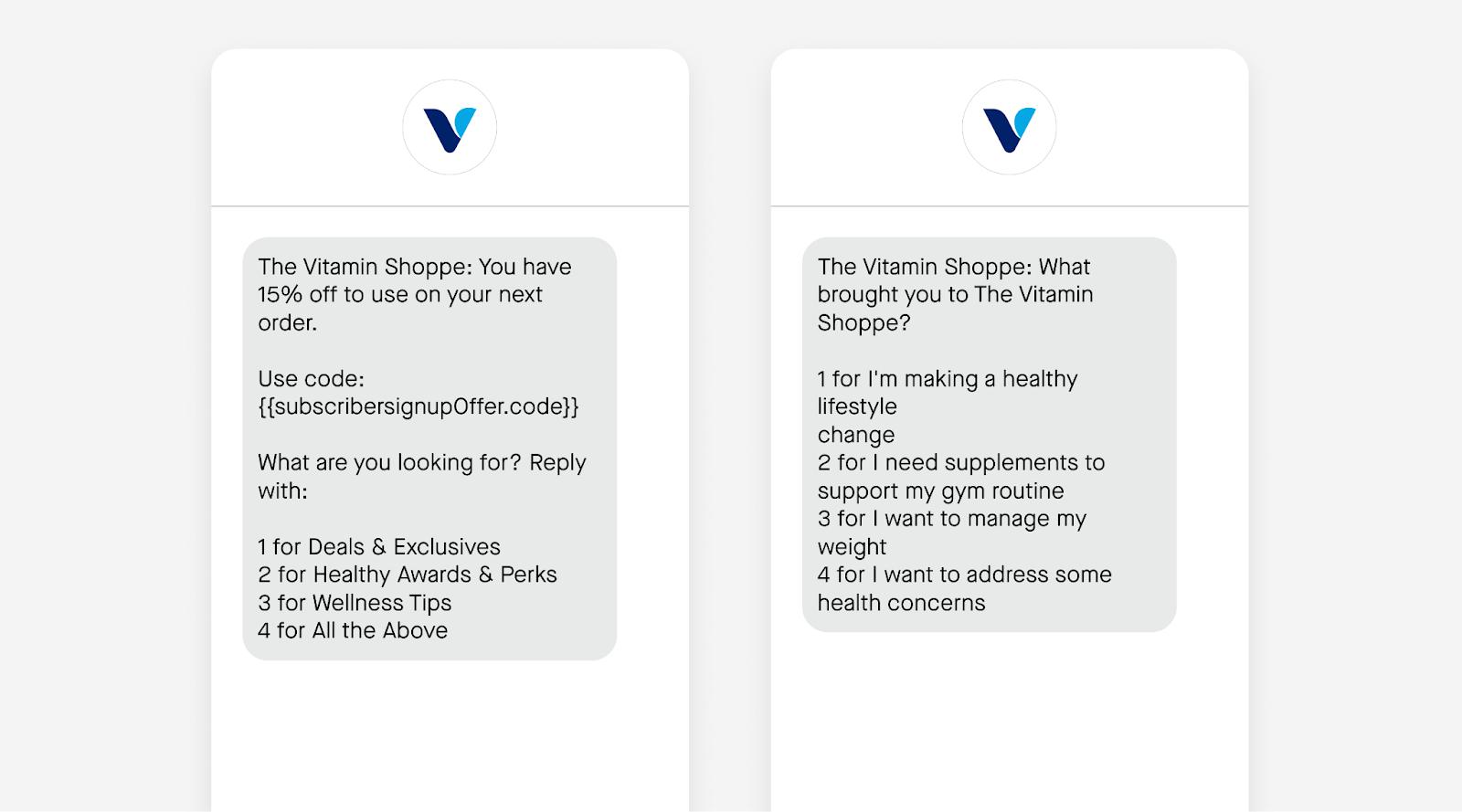 By using Attentive’s Two-Way Journeys™ in their welcome flow, The Vitamin Shoppe is able to gather individual preferences from the onset. Upon opting into SMS, subscribers are prompted to answer questions about their shopping interests and the type of updates they want to get (such as new product launches).