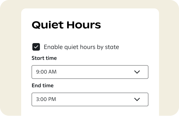 Restrict when messages are sent in TX, FL, OK, MD, CT, and WA with enabled quiet hours and improved location detection to reach more of your audience at the right time.