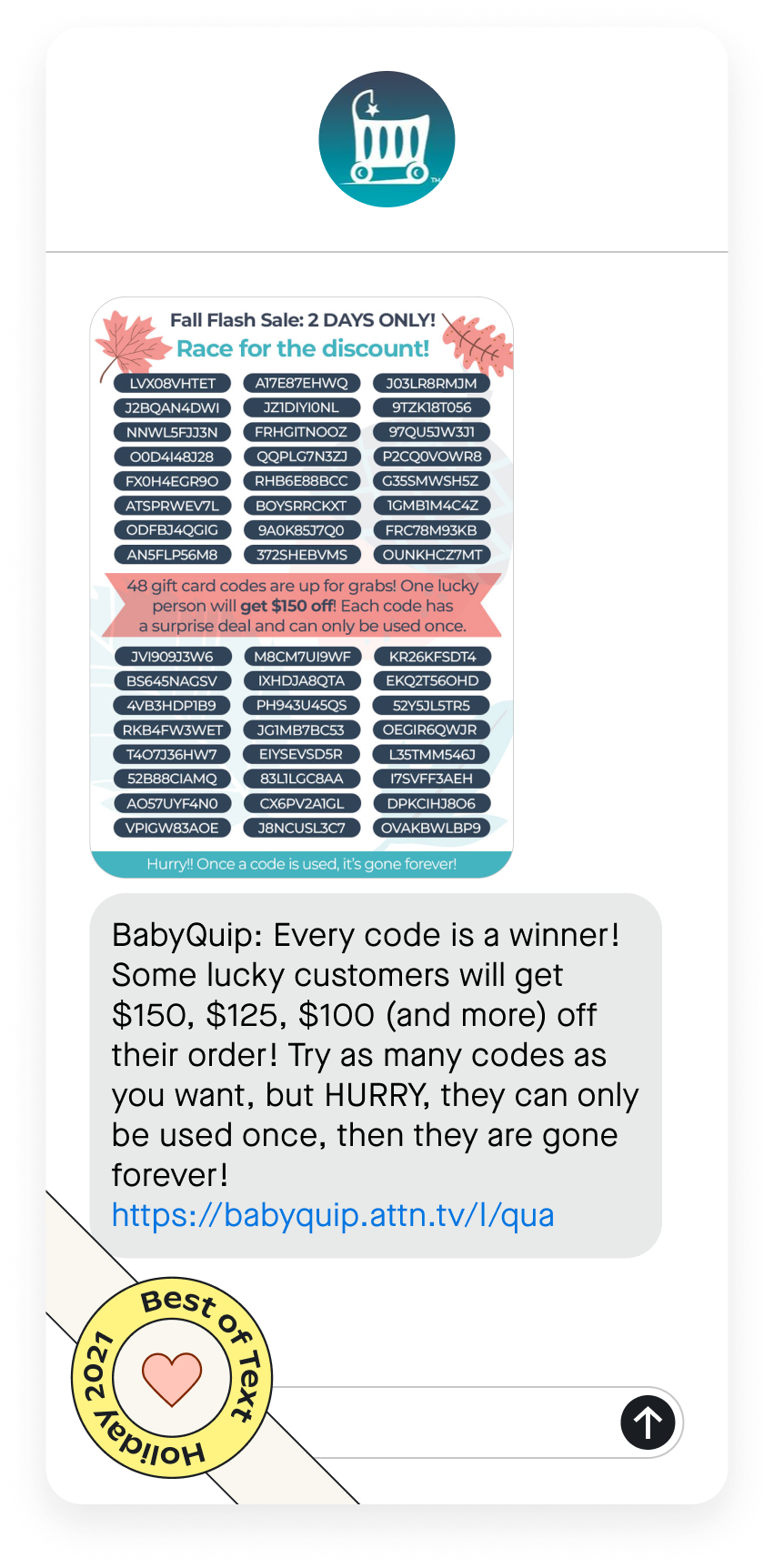 BabyQuip’s “race for the discount” campaign encouraged SMS subscribers to spontaneously shop with a gamified experience. The enticing prizes and urgent messaging (“HURRY”) instantly drove website traffic and revenue. The gamified campaign was a bright star in creating buzz and driving traffic from an SMS audience, making it the winner of the “Shine Award” in our Best of Text: Holiday 2021 Edition.