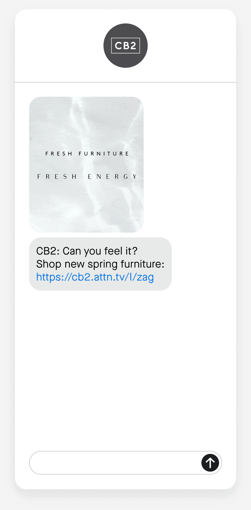 Modern home decor brand CB2 used text messaging to let their subscribers know about new spring furniture. They took their message strategy a step further by creating several category-focused new arrival messages and targeted subscribers based on their browse history (e.g. browsed furniture, lighting, etc). Using data to segment text messaging sends is an effective way to send highly relevant content to your subscribers. CB2 also included an eye-catching GIF that previewed an item from the new collection.