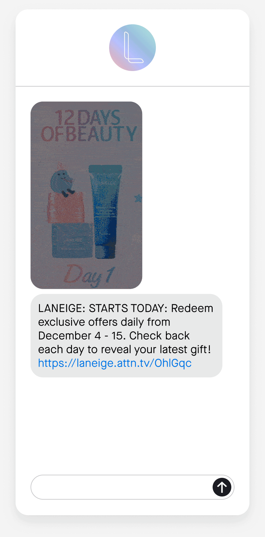 Korean skincare brand LANEIGE sent SMS subscribers an exclusive offer to promote their 12 Days of Beauty holiday campaign. The text message included a GIF that reveals the gift for that day and a reminder to “check back each day” to reveal the latest gifts. The colorful graphic adds a fun touch of holiday spirit into the campaign, and the countdown element of this campaign builds excitement for shoppers as they await a new surprise each day.
