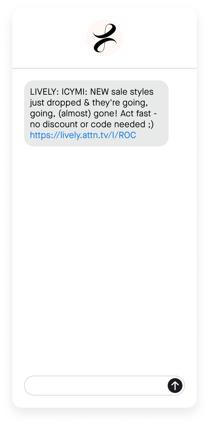 LIVELY uses the Attentive Copy Assistant to generate copy for their campaigns. Whether they need to send out last-minute comms or schedule multiple messages—like this one promoting popular styles that are selling out fast—the AI tool has proven to be a big time saver for them. It's like adding an extra member to their small but mighty CRM team, enabling them to craft on-brand SMS copy more quickly and easily.
