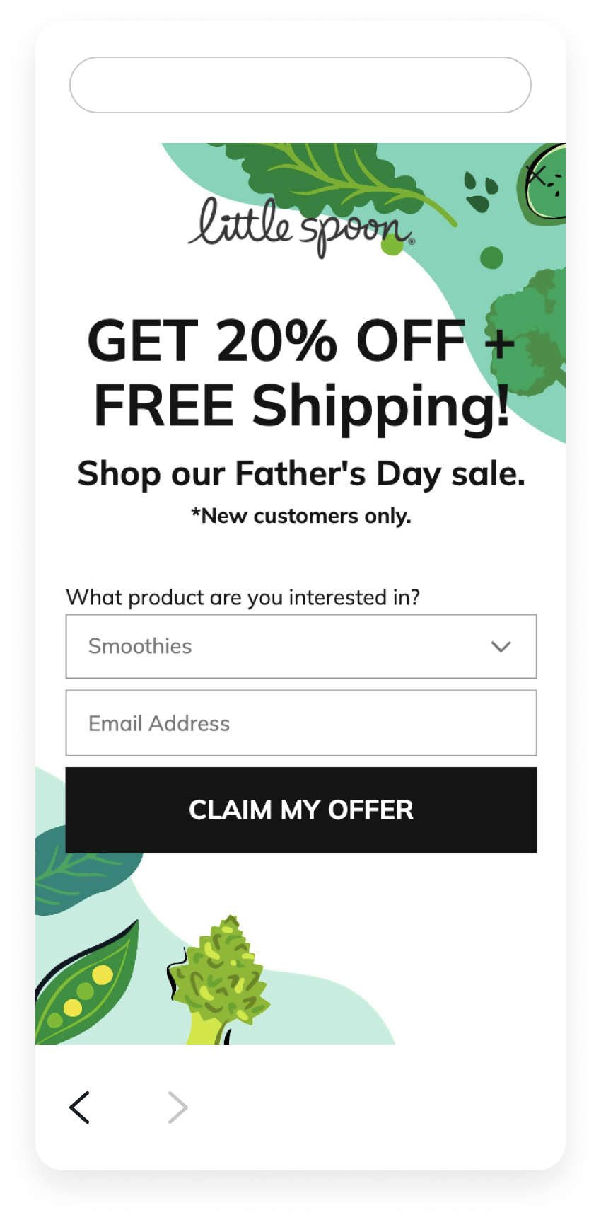 Little Spoon launched a custom sign-up unit to help turn Father's Day gift-shoppers into email and SMS subscribers. They put their 20% off plus free shipping offer front and center, and included a Preference Collection form for new subscribers to specify their product interests. That way, the brand could personalize future campaigns and increase the likelihood of first-time buyers coming back to make second (and hopefully, third) purchases.