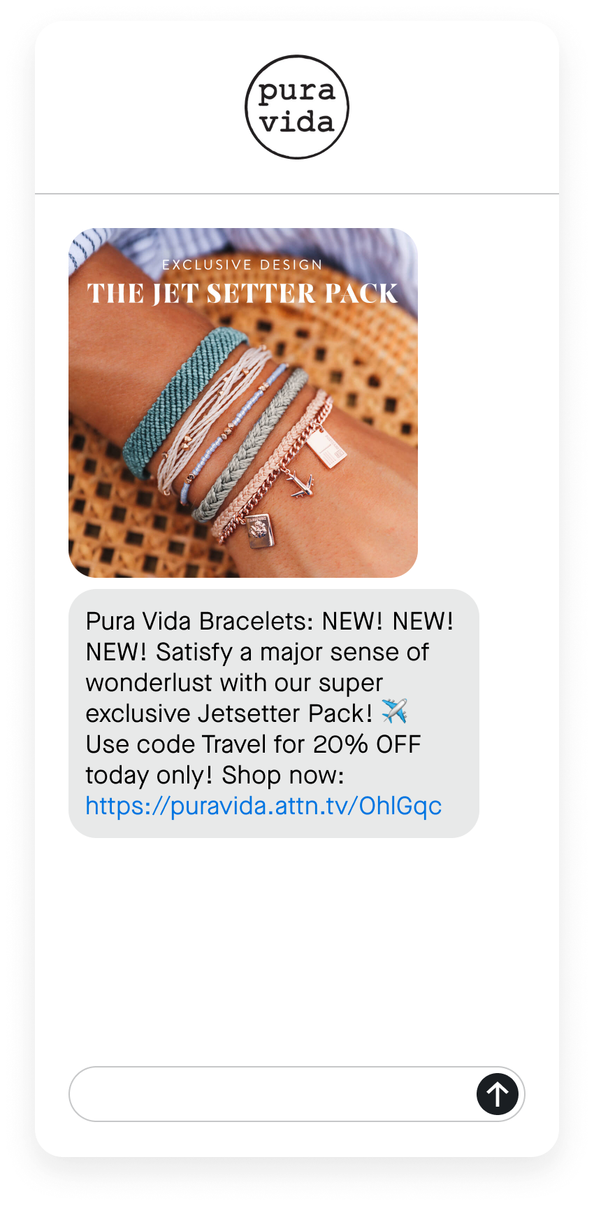 Philanthropic accessories brand Pura Vida Bracelets texted subscribers to announce their newly-launched product pack. The limited-time “today only” offer created a sense of urgency to excite shoppers about the new product, while also providing a 20% off discount. The playful messaging (“major sense of wanderlust”) coupled with a colorful image, plus the use of an emoji, appeals to the brand’s target audience of Millennial and Gen Z shoppers.