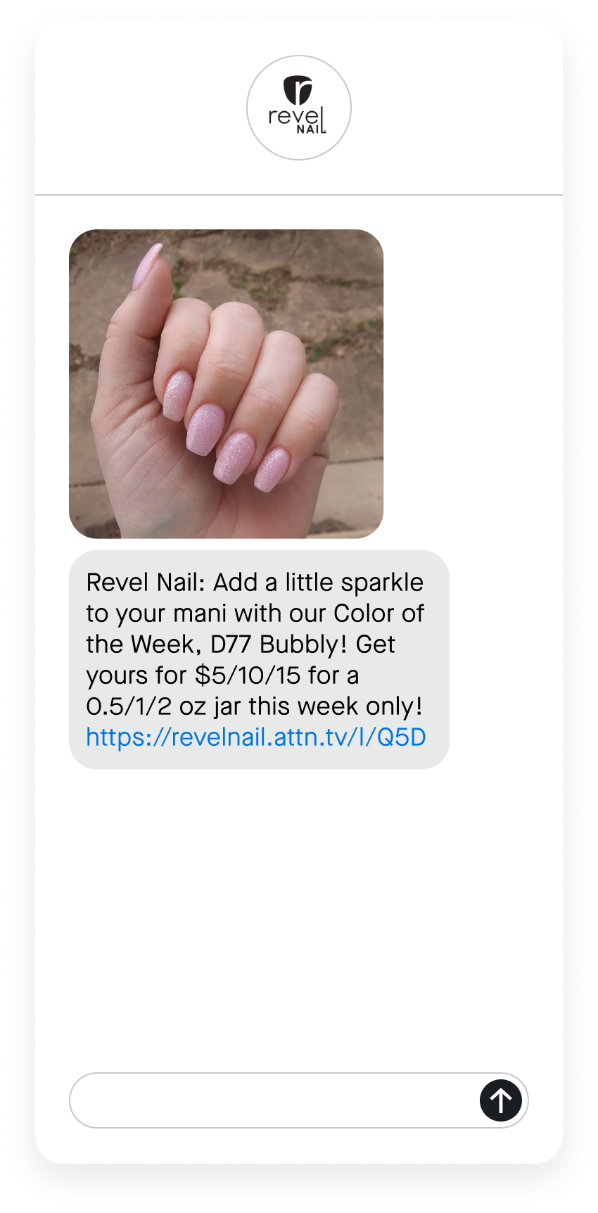 At-home dip powder and nail accessory brand Revel Nail texted SMS subscribers about their Color of the Week offer, available at the special pricing for a limited time (“this week only!”). They included an image of the color and detailed the offer within the text message—including the price for each size of jar. They ended the message with a direct link to the product so shoppers could quickly complete their purchase.