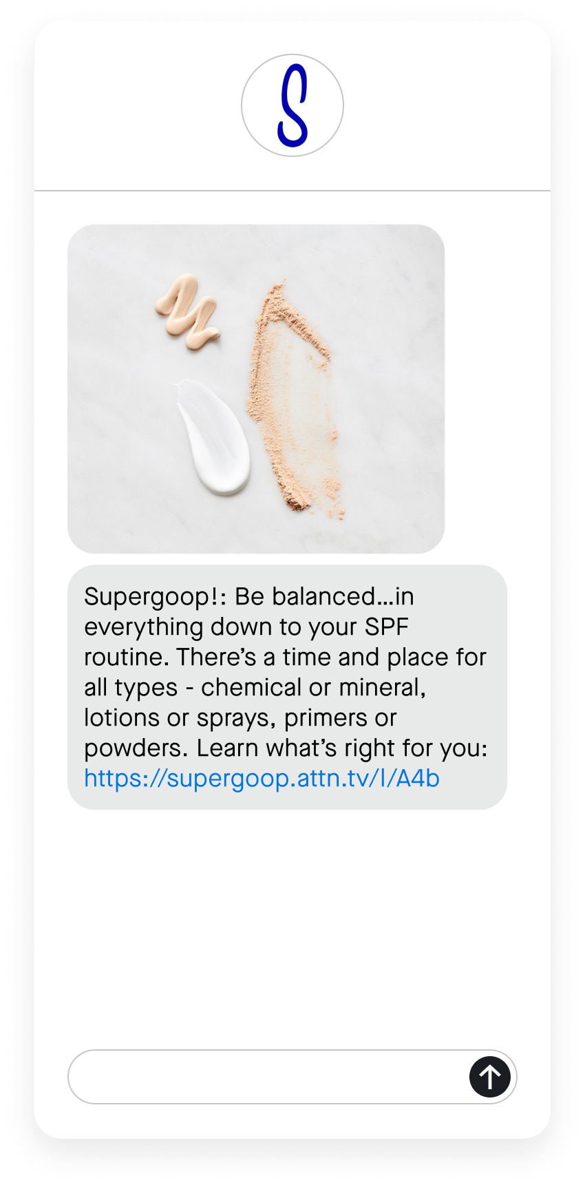 Protective skincare brand Supergoop! uses text messaging to educate subscribers about the many benefits of protecting themselves against the sun. In this text message, they mention different SPF options—including lotion, sprays, and powder—and encourage subscribers to find the right one for them. They also included an image with three different product examples. Supergoop!’s innovative use of this channel provides quality content that directly relates to available products.