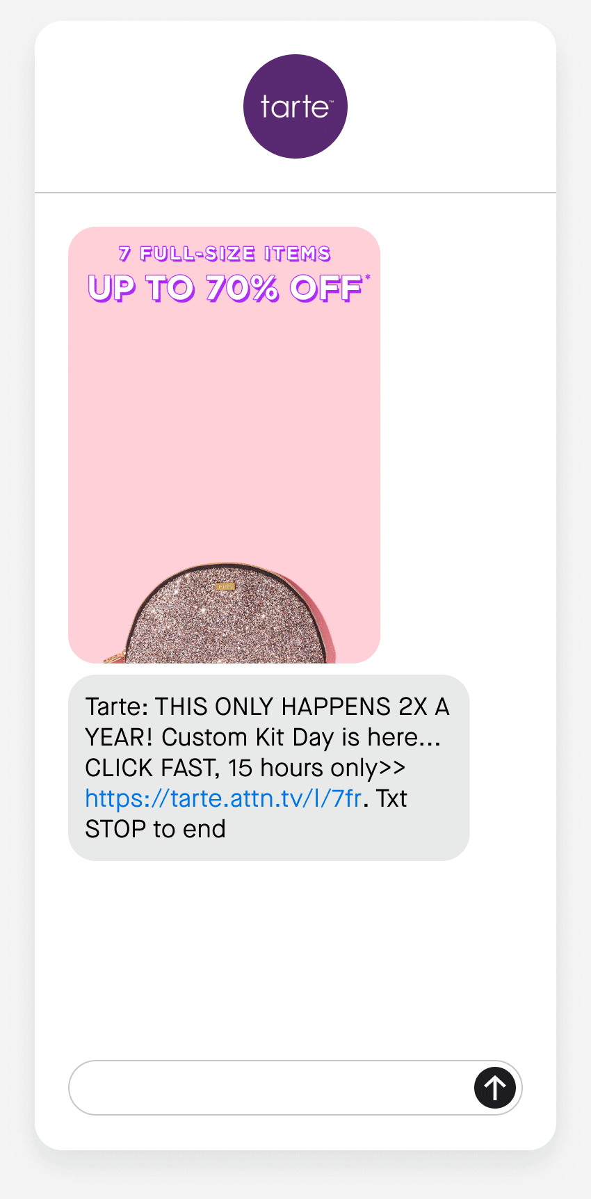 The immediacy of text messaging makes it the perfect channel for marketers to spread the word about limited-time deals. Beauty brand Tarte Cosmetics creates a sense of urgency and shares timely information that’s beneficial to shoppers, especially because this specific offer only happens two times per year and for a very limited period of time. The custom graphic showcases the deal and Tarte Cosmetics’ products in a unique and engaging way.