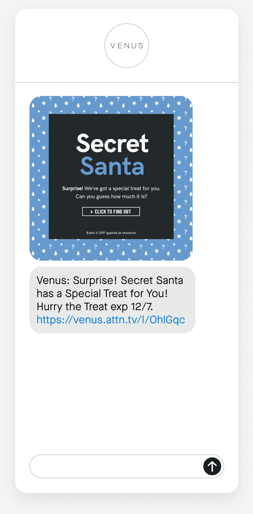 Apparel retailer Venus sent a “special treat” to text messaging subscribers. They included an eye-catching animated GIF with “Secret Santa” in big text. Underneath, in small text, Venus wrote, “Surprise! We’ve got a special treat for you. Can you guess how much it is?” Venus played into the holiday spirit by positioning the “treat” as a gift from their “Secret Santa.” They also instilled a sense of urgency by including the expiration date in the message.