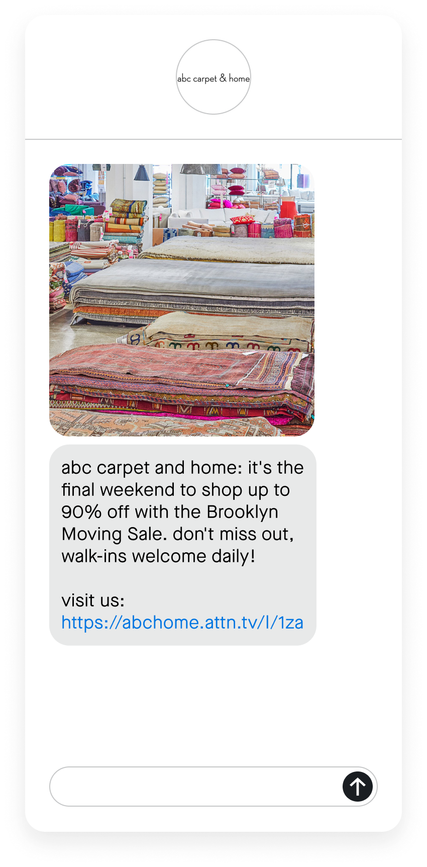 When ABC Carpet & Home opened their Brooklyn location, they invited SMS subscribers to see it for themselves. The special event invitation used geotargeting to only reach relevant subscribers in the NYC area. With the in-store display image and direct link to browse the website, subscribers could conveniently start exploring products online, then take advantage of the discounts in-store.
