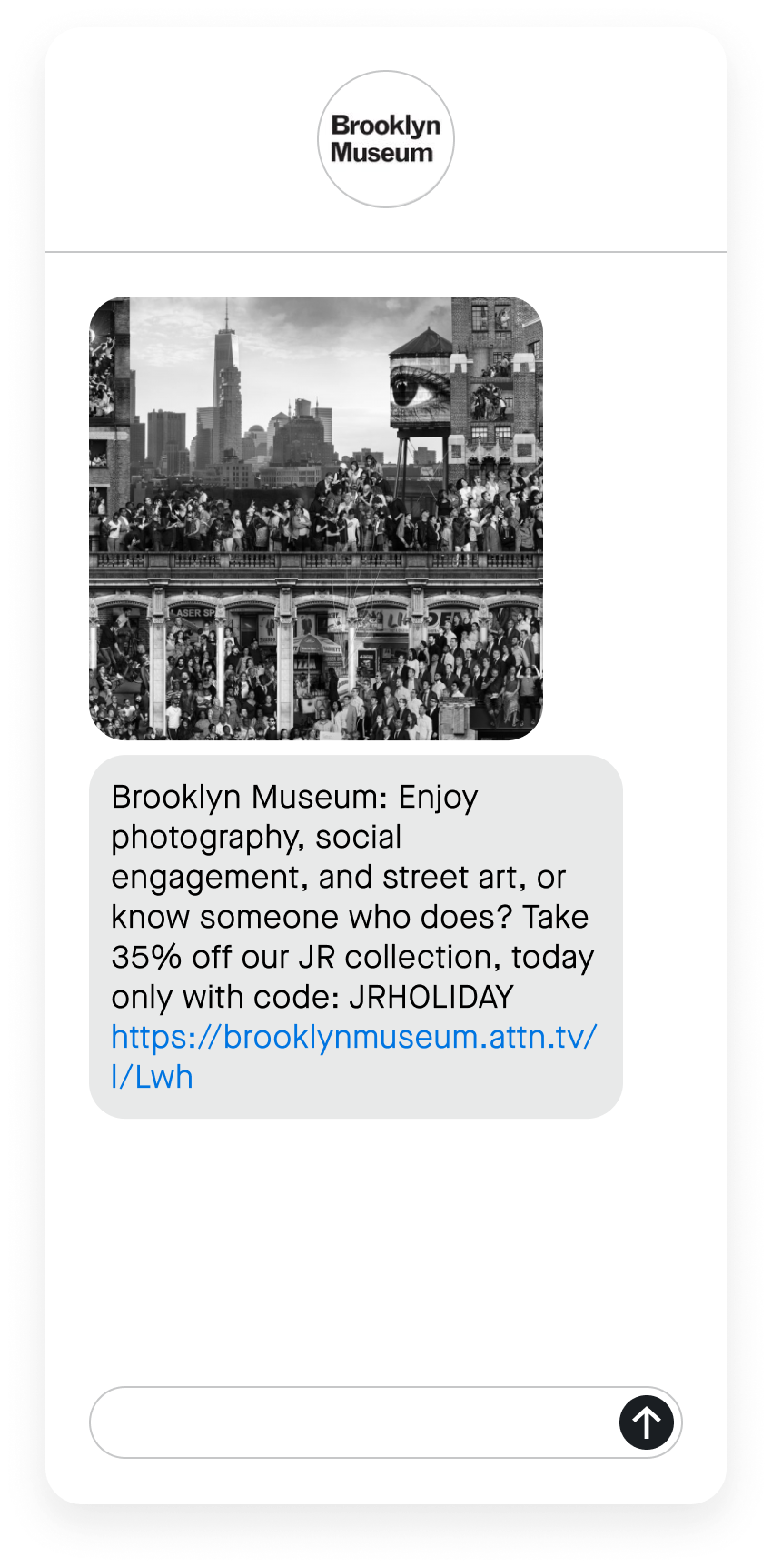 During the holidays, the Brooklyn Museum texted SMS subscribers about the store’s JR collection. The message includes a recognizable image of the artist’s work and conveys a sense of urgency, encouraging subscribers to take advantage of the “today only” offer for holiday gifting.