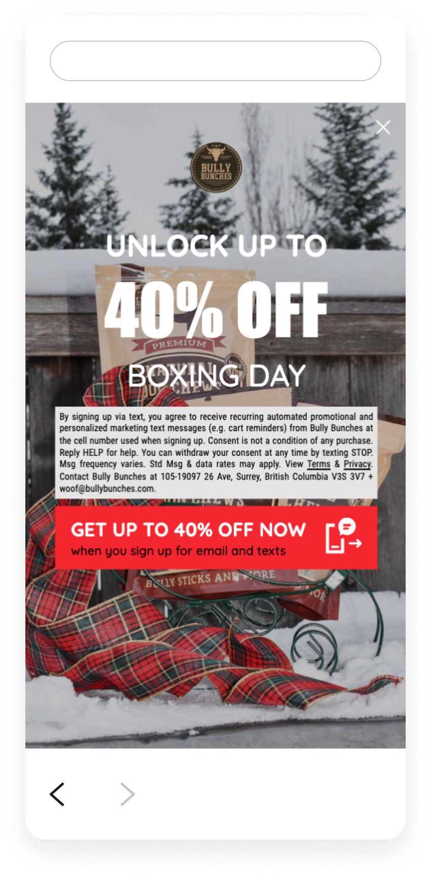 Bully Bunches launched a Boxing Day sign-up unit on their mobile site to simultaneously grow their text messaging and email subscriber lists. The dog food brand was already offering 40% off to existing subscribers for the holiday. So, this seasonal sign-up unit encouraged new shoppers to join without having to offer additional discounts.