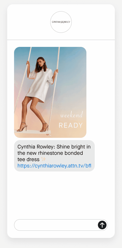 Fashion and lifestyle brand Cynthia Rowley announced their new “bonded tee” dress to their SMS subscribers. They paired this text message with a GIF that shows off the dress and styling inspiration, and ended with a direct link to the product page. Promoting this product launch via SMS excited subscribers and encouraged them to be the first to shop the new style.