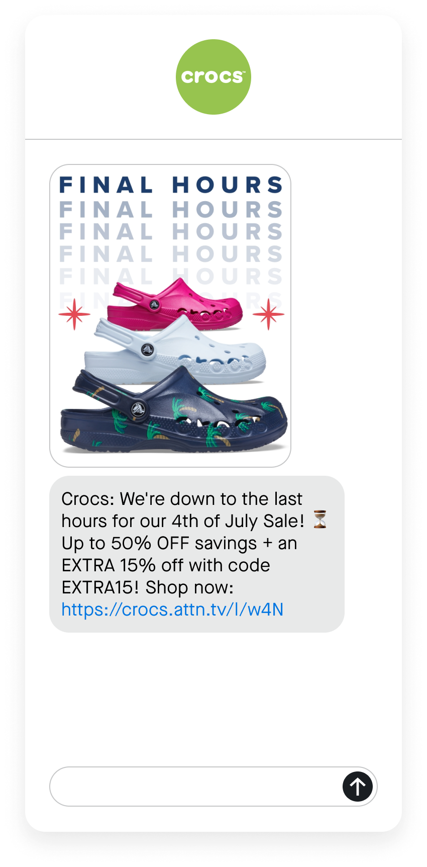 Crocs offered customers a huge deal for the 4th of July: up to 50% off for a limited time. The brand used bookending to drive engagement and conversions throughout the sale period, making sure to exclude recent purchasers from getting too many follow-up messages. Later, Crocs offered shoppers an extra 15% off to incentivize more purchases during the final hours of the sale and maximize overall revenue.