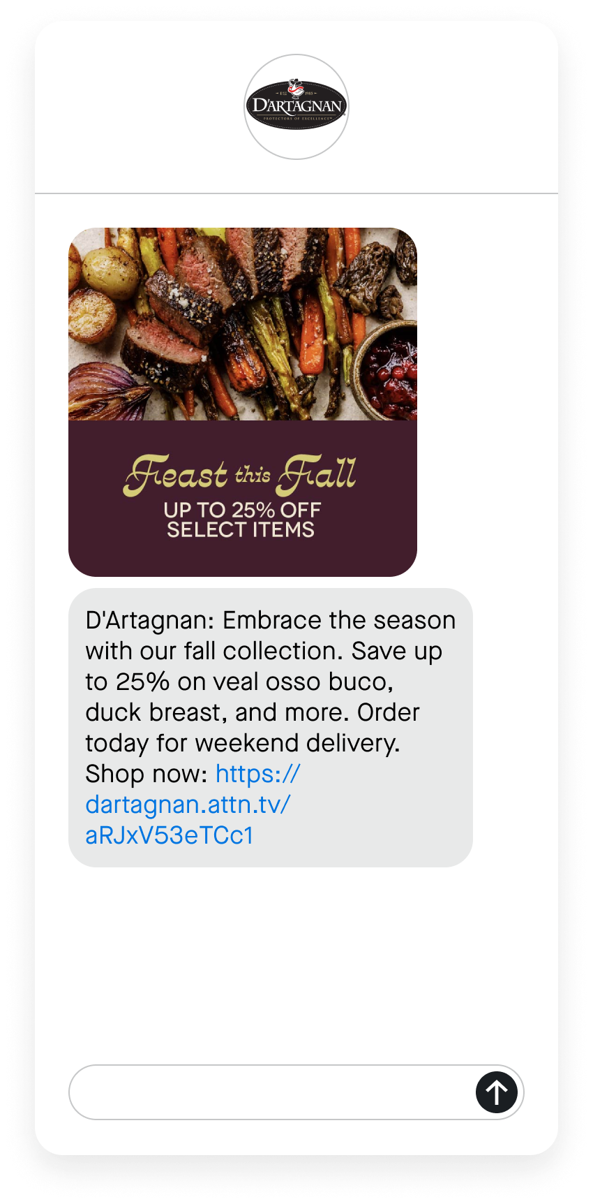 The leaves were falling, and so were the prices on D’Artagnan’s fall collection. The brand texted subscribers letting them know they could save up to 25% on select meats and that if they ordered right away, they’d get their deliveries that same weekend. The color scheme of the image worked with the fall theme and literally helped customers picture what could be included in their fall feasts.