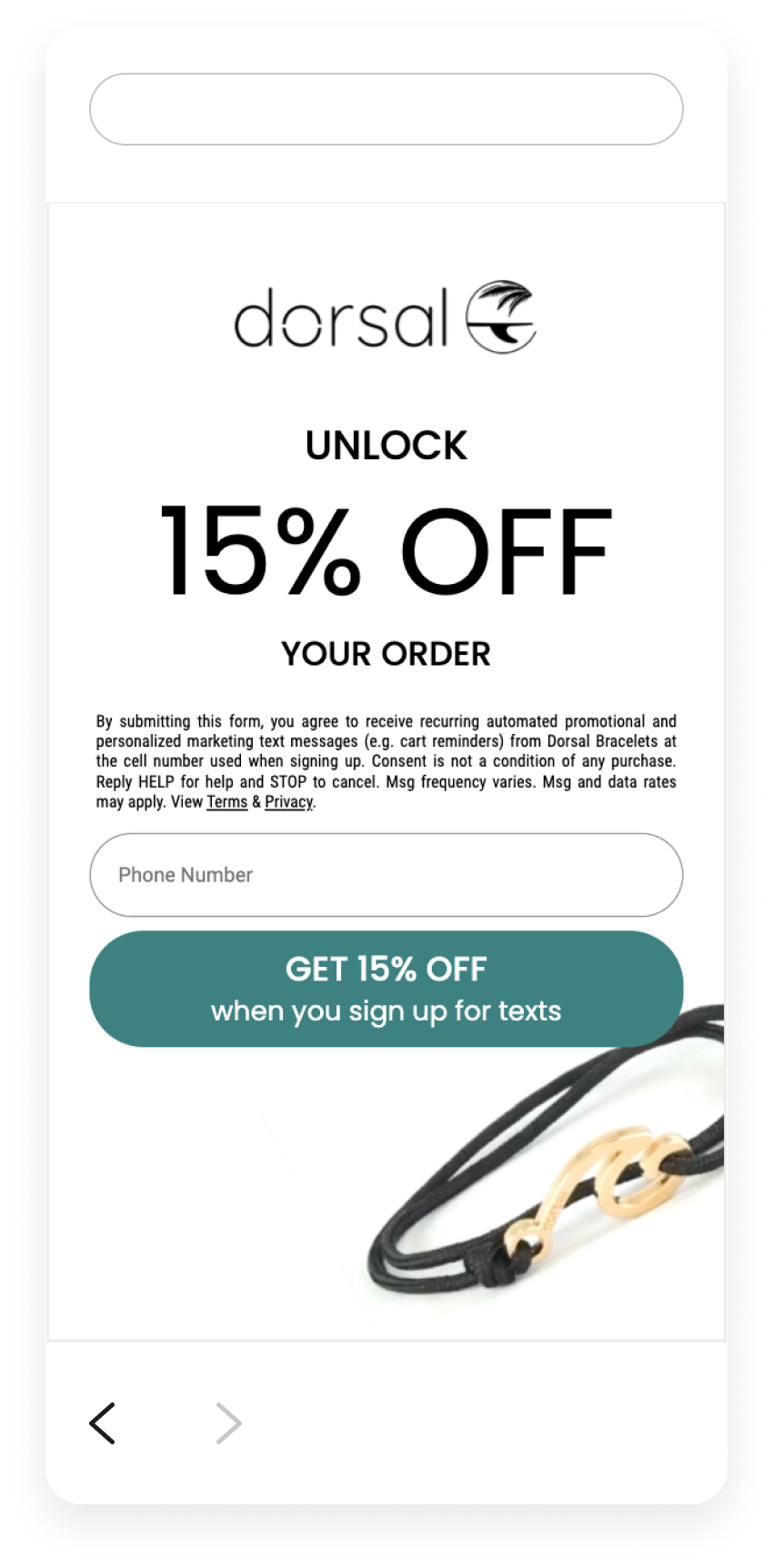 Dorsal Bracelets converts high-intent browsers into subscribers with their mobile website’s sign-up unit. The lifestyle jewelry brand quickly grows their SMS subscriber community by offering a 15% off discount. After subscribers join, they receive an automated series of “welcome” messages introducing them to the brand and their eco-friendly values.