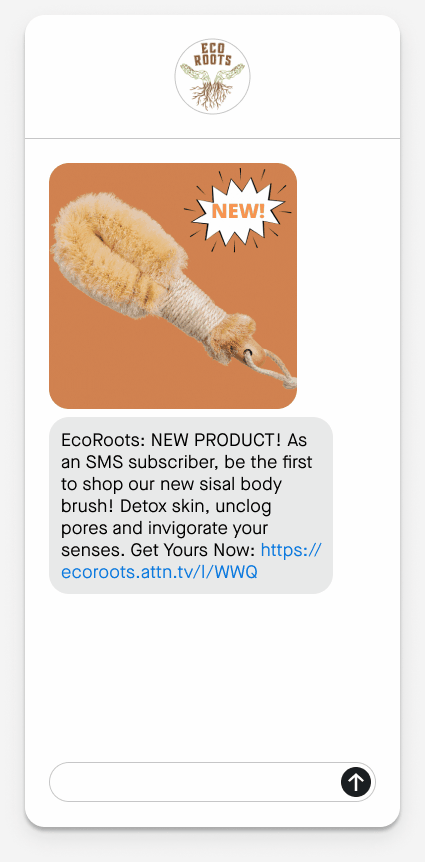 Zero-waste beauty brand EcoRoots announced their new body brush to their SMS subscribers. They showcased the new brush and how to use it by including a GIF in the text. EcoRoots made it easy for subscribers to add the item to their carts by ending the text with a direct link to the product page. Promoting this launch via SMS excited subscribers and encouraged them to be the first to try it.