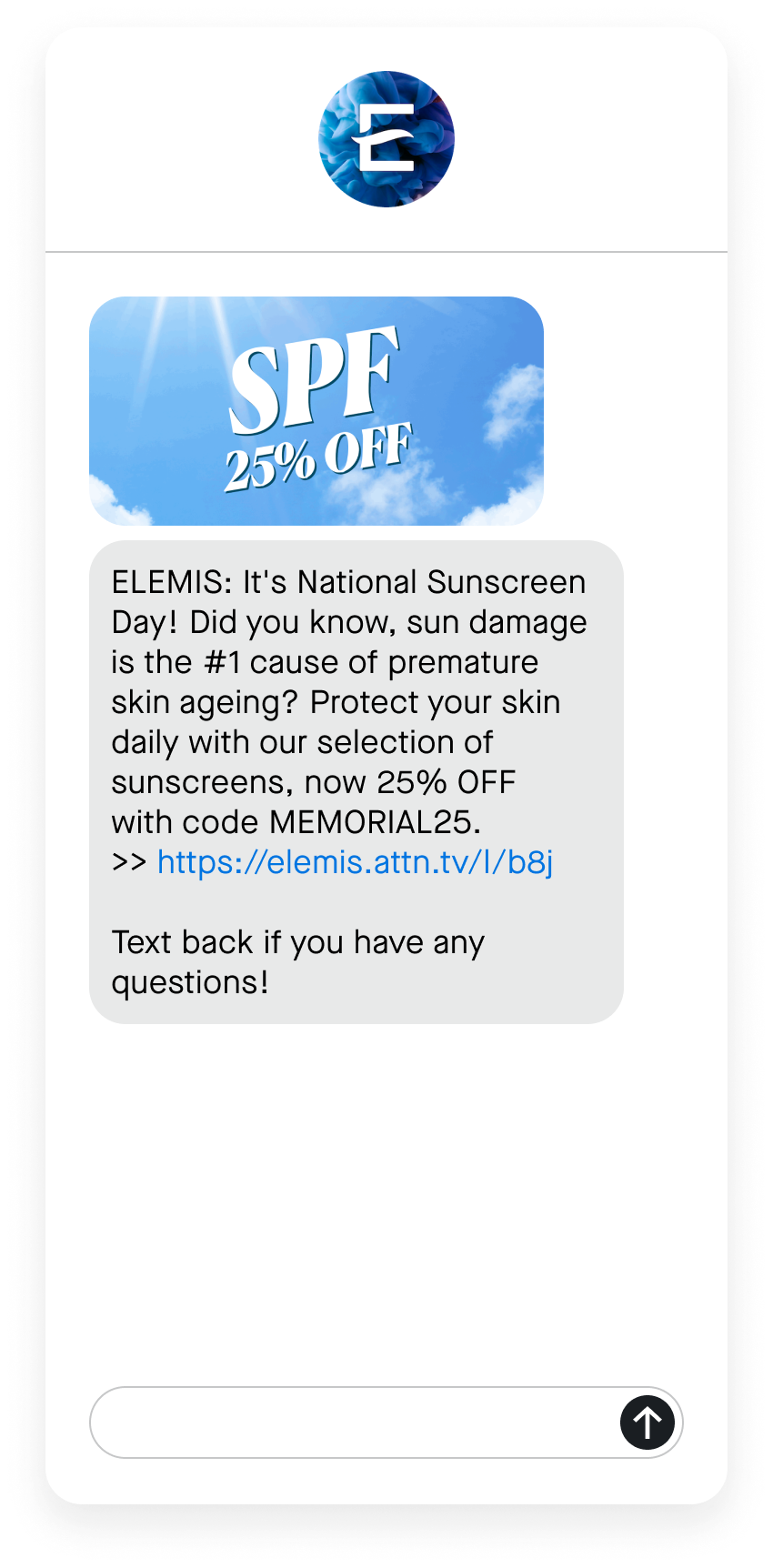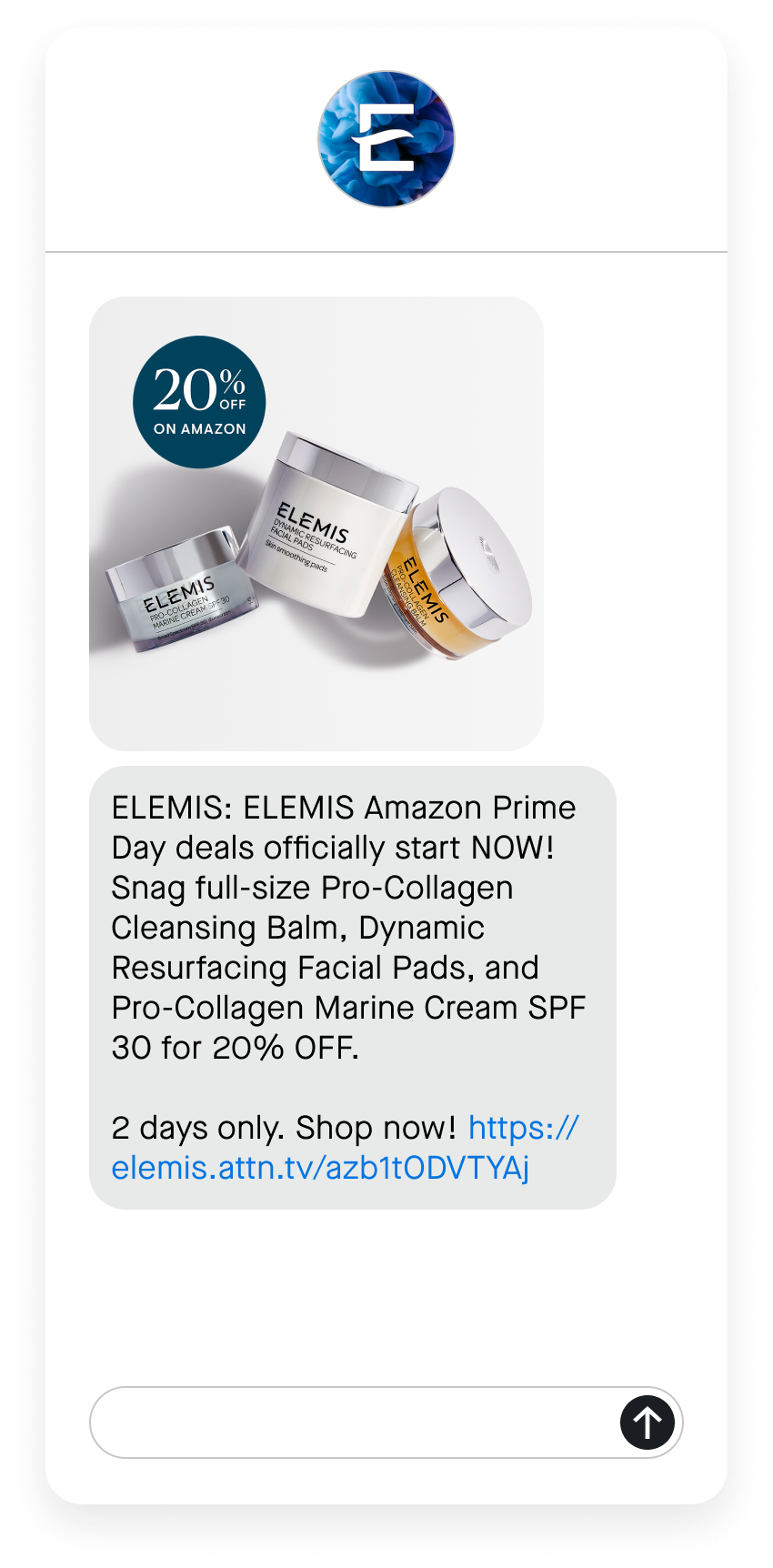 Skin care brand ELEMIS sent this SMS message announcing their offers for Amazon Prime Day, which took place in mid-July. During the two-day sales event, shoppers could save 20% on some of their favorite full-sized products. ELEMIS listed the products that were included in Amazon Prime Day deals so subscribers knew immediately if their preferred product was on sale and could buy ASAP.
