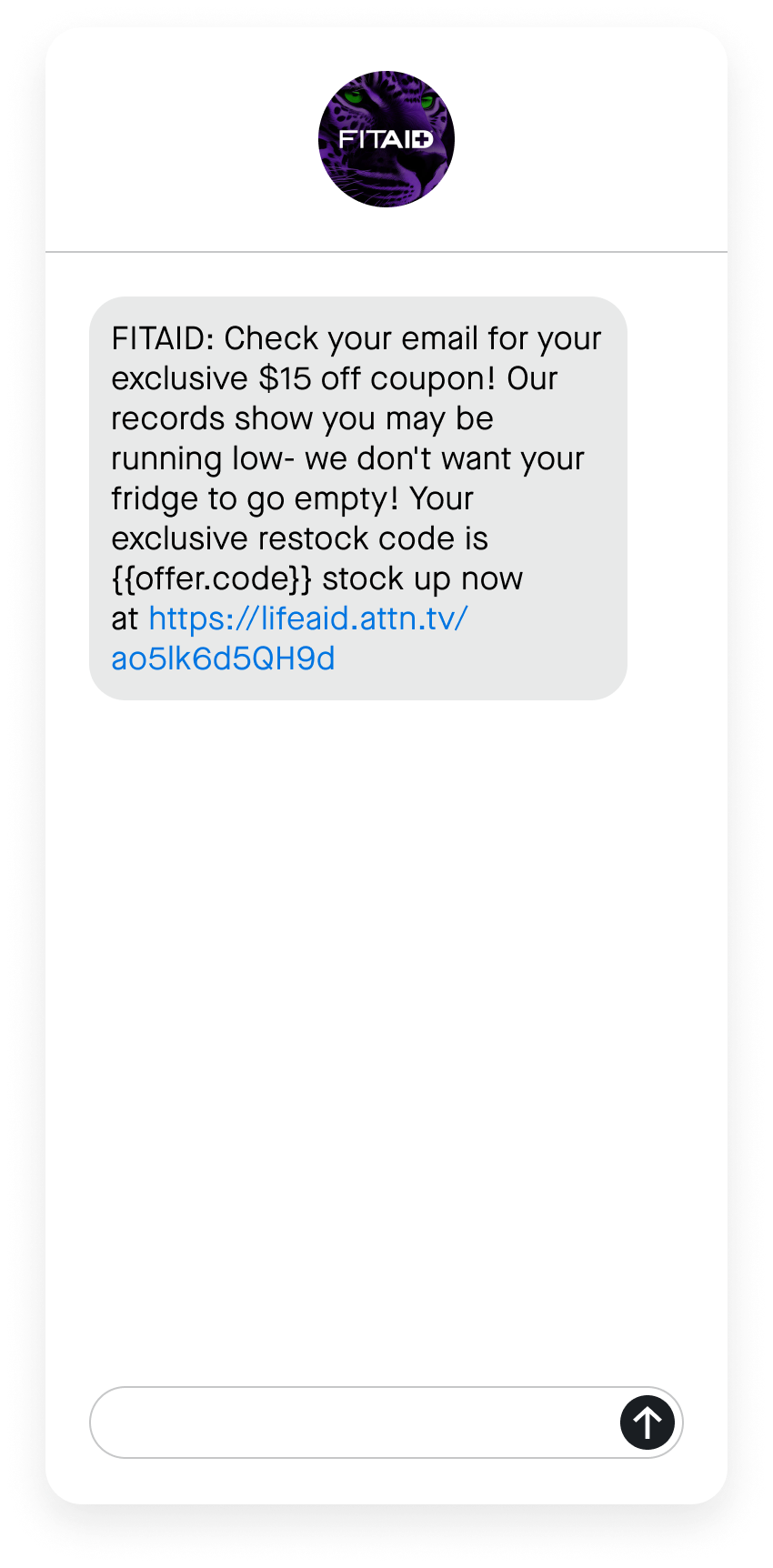 FITAID perfectly timed this SMS send as new customers were probably close to running out of the product they recently purchased. It was time to restock, and time to take advantage of an SMS-exclusive coupon to help subscribers save. This incentivized immediate purchases and fostered a sense of loyalty as FITAID is on top of knowing when it’s time to re-order before customers run out of their favorite products.