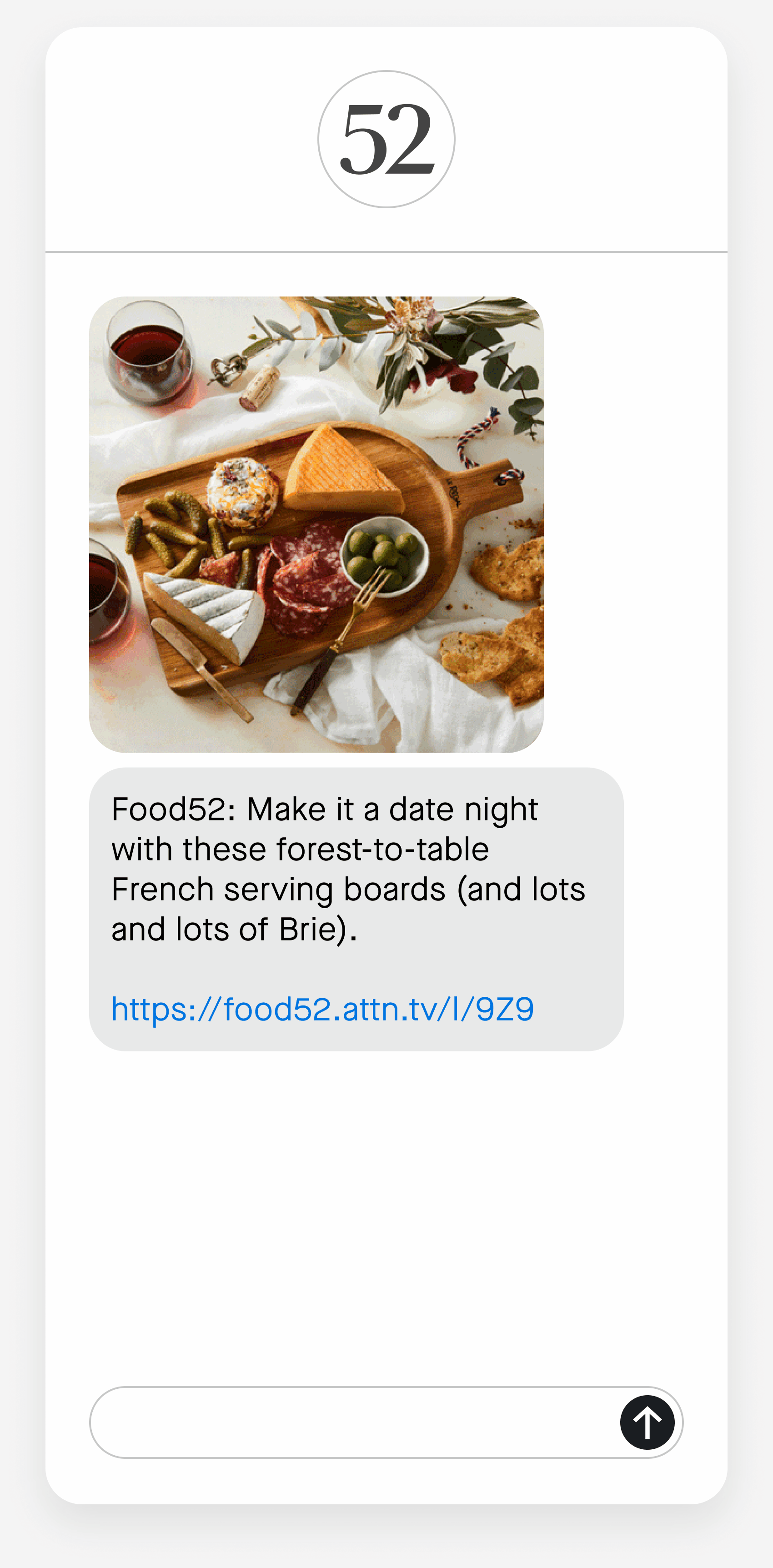 Food52—innovator in the food, cooking, and home space—promoted their French Oak Serving Boards to text messaging subscribers. They included an eye-catching GIF of the product being used, with “lots and lots of Brie,” to inspire subscribers with different ways to use the serving boards. The text ended with a direct link to the product, so subscribers could easily complete their purchase.