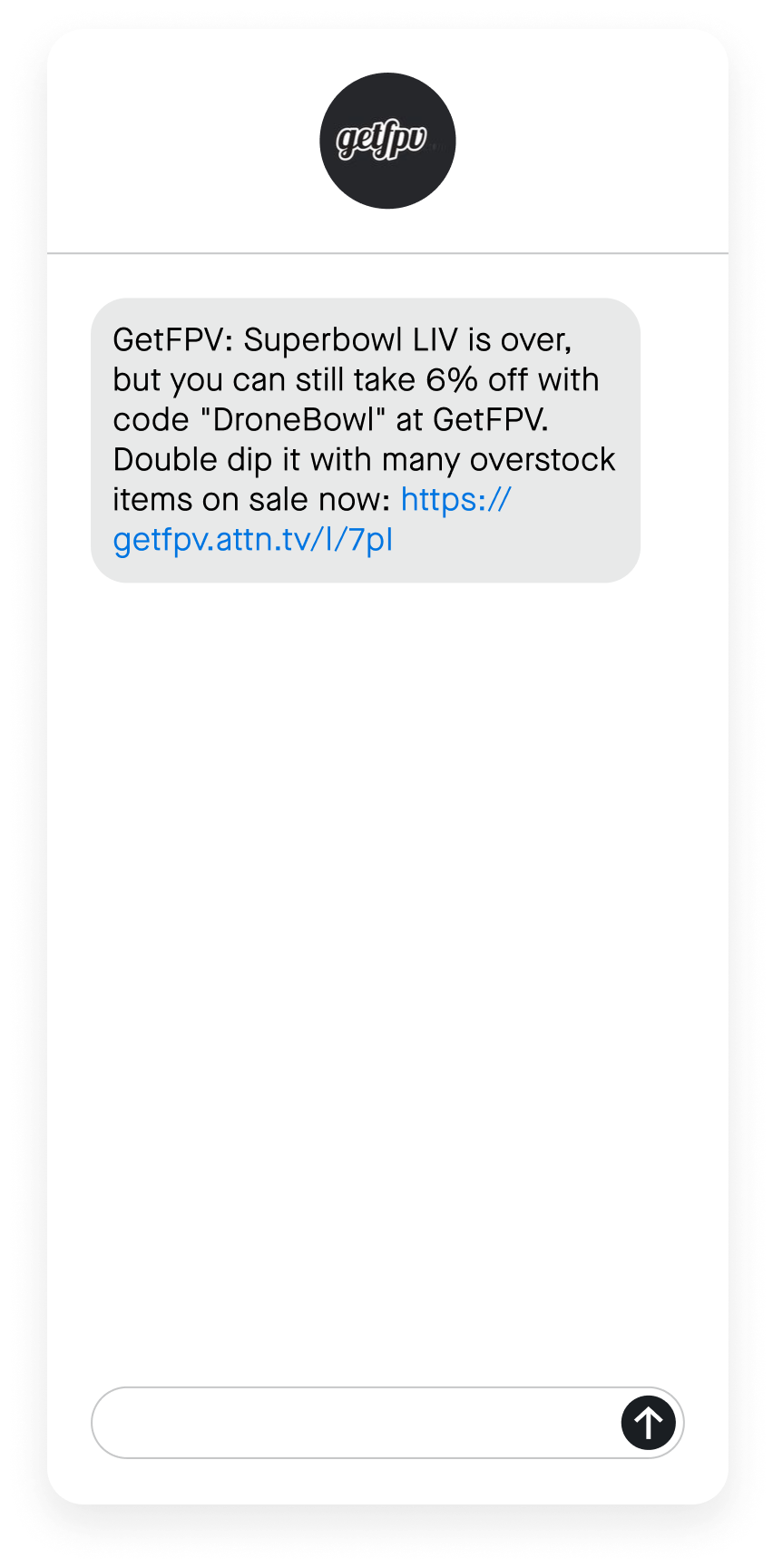 GetFPV drove online revenue into overtime with their post-game campaign. As customers were on their phone decompressing from the day’s celebrations, this was the perfect opportunity to connect with their SMS audience and promote overstock orders.