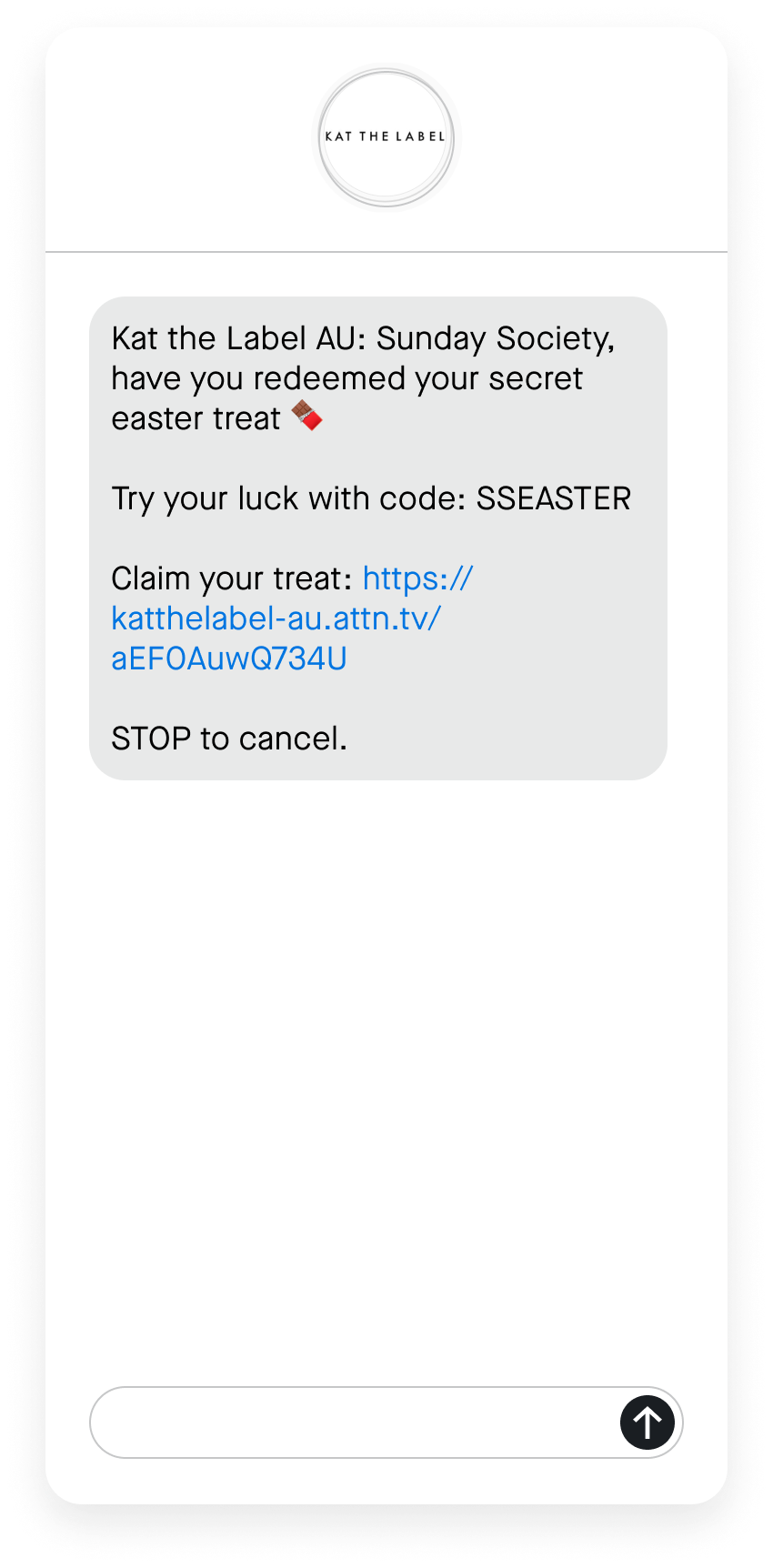Kat the Label AU texted their loyalty program members with an exclusive treat for the Easter holiday. They used their program’s initials, Sunday Society, in the promo code to make it easy to remember and use on the website. They also kept up an air of mystery as they didn’t spoil what the Easter treat was and encouraged customers to claim the secret offering to find out.