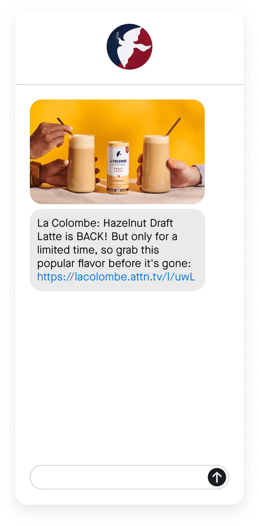La Colombe Coffee Roasters sent a text to subscribers to let them know their bestselling coffee and cold brews are available in bulk sizes. This is an effective strategy to help subscribers learn more about your brand and encourage them to make a purchase, without having to provide a discount or special offer.