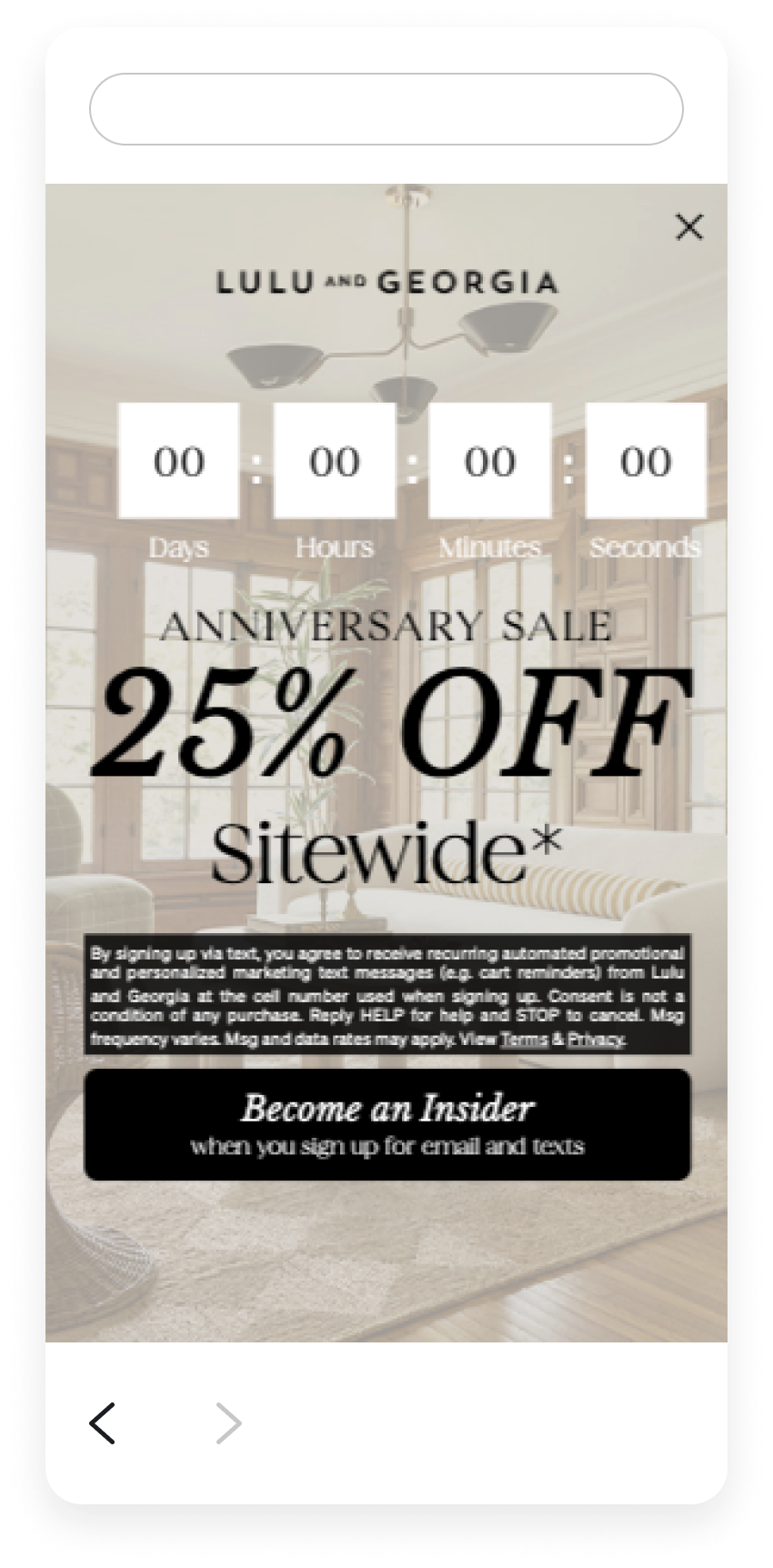Customers were eagerly awaiting Lulu & Georgia’s anniversary sale offering 25% sitewide, and a countdown timer made it even easier for them to know exactly when to come back to the website and shop. Website visitors could become Insiders and get emails and texts to be notified of other sales or exclusive offers.