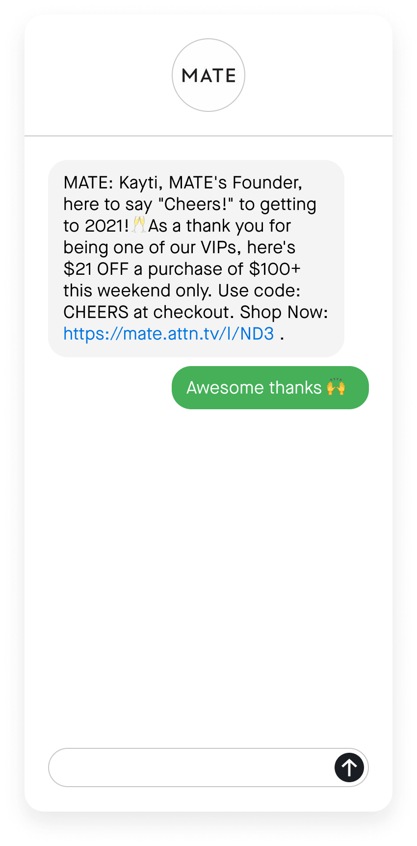 MATE The Label rang in the New Year with an exclusive dollar-off discount to nurture both new SMS subscribers they gained during the holidays and long-time brand loyalists. The personal greeting from the brand’s founder positioned the offer as a “thank you,” making each of their SMS subscribers feel special.