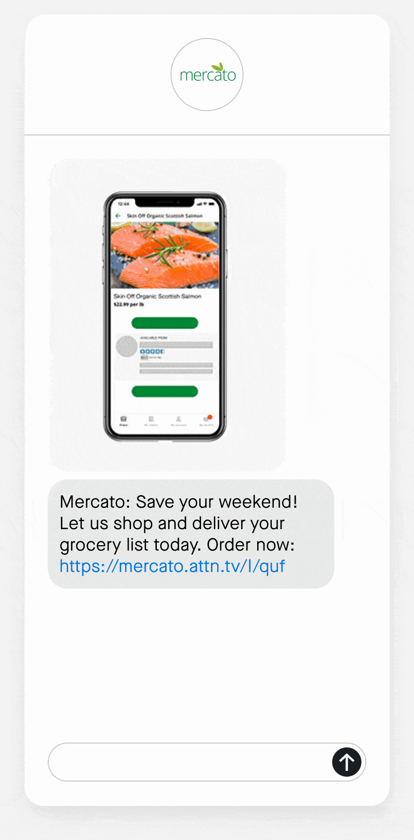 Grocery delivery brand Mercato sent a helpful text message to subscribers, encouraging them to “save your weekend!” and let Mercato do their grocery shopping. The delivery brand ended the message with a clear CTA to “order now” and direct link to complete their order.