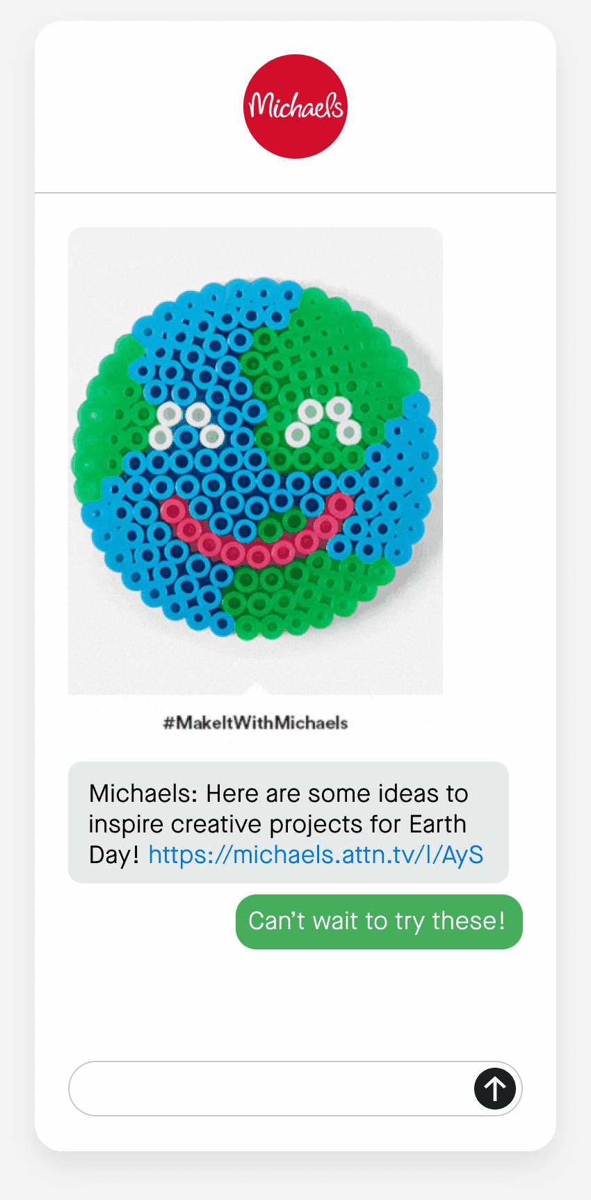 Michaels inspired their SMS audience to get creative on Earth Day with a curated collection of craft projects. They spoke to subscribers’ preferences by sending these child-level crafts to their “Kids Shoppers” segment—subscribers who had browsed or purchased kids’ products in the past. The direct link took customers to the “Earth Project” collection, where they could browse projects, explore step-by-step instructions, and shop for materials.
