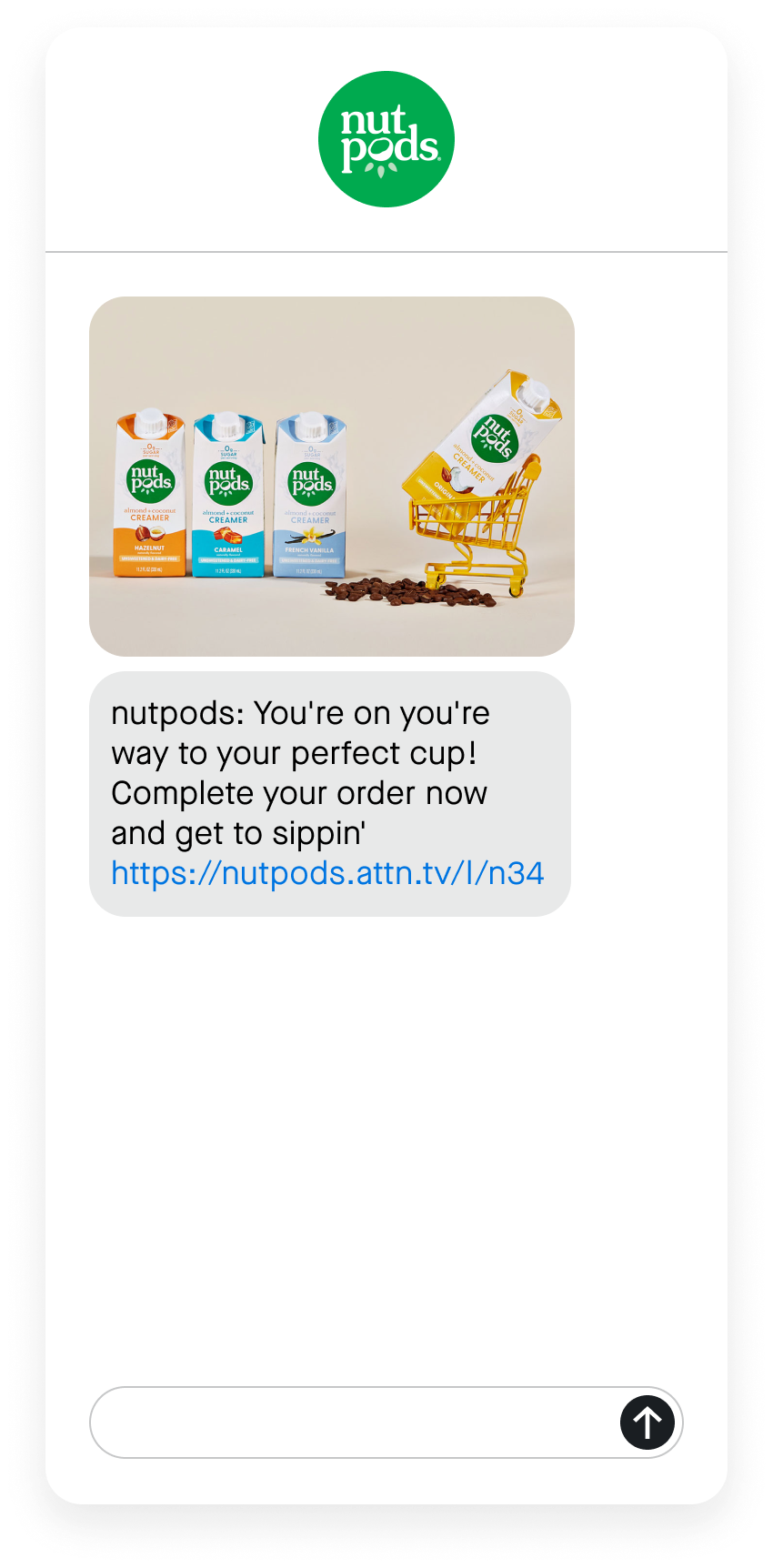 Dairy-free coffee creamer brand nutpods sends well-time abandoned cart reminders to SMS subscribers who’ve left the site before completing their purchase. The brand uses their playful brand voice in the text (“get to sippin’”) and includes an image to help remind subscribers what they’ve left behind.