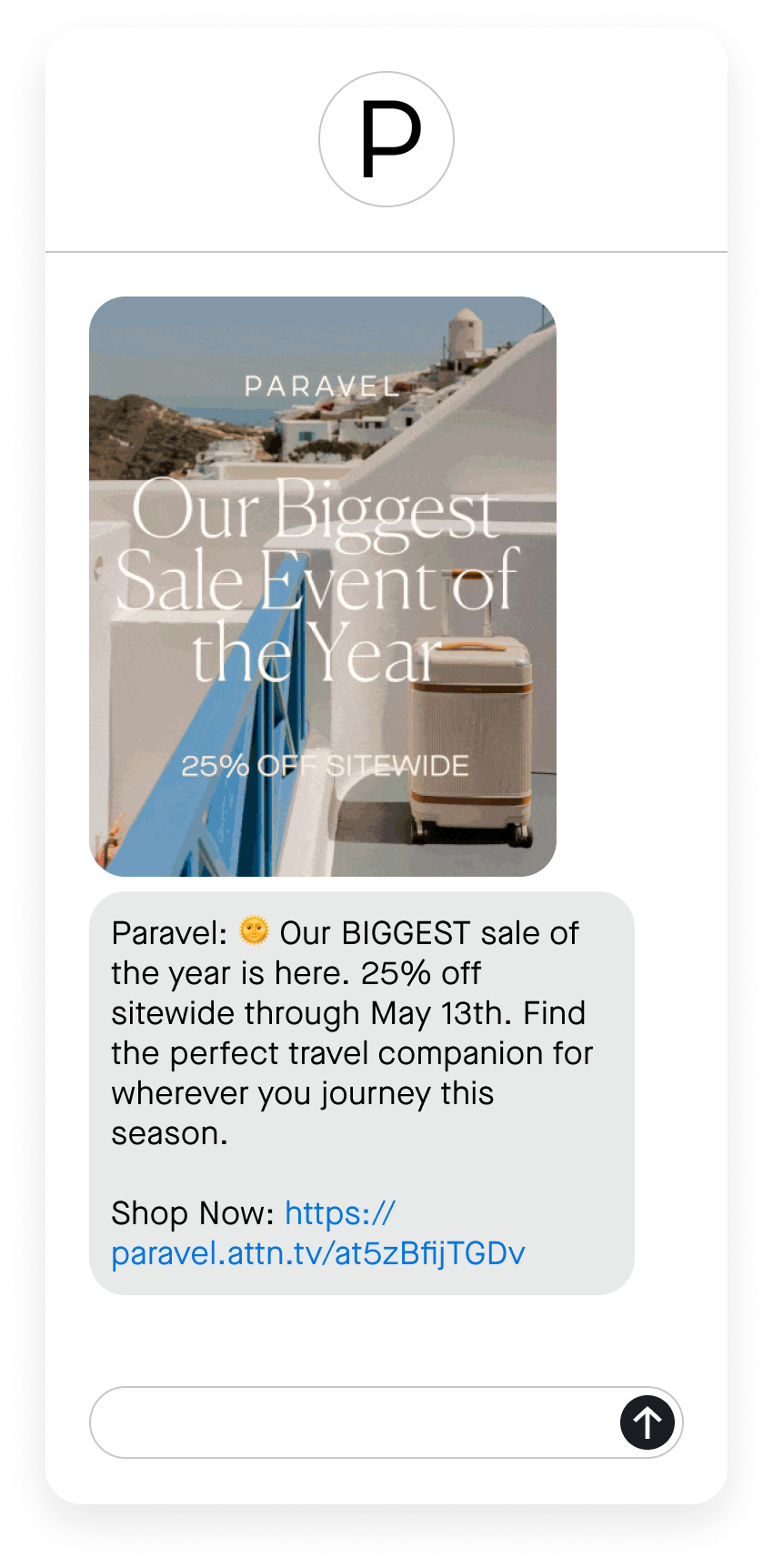 Designer fashion brand Rebecca Minkoff shared a “Secret Sale” exclusively with their SMS subscribers, reserving the deal for these highly engaged customers. Keeping the message short, they used a colorful graphic to stand out and describe the sale’s details. The brand emphasized the sale’s exclusive nature (“SECRET”)—encouraging in-the-know subscribers to take advantage of the text channel perk and shop.