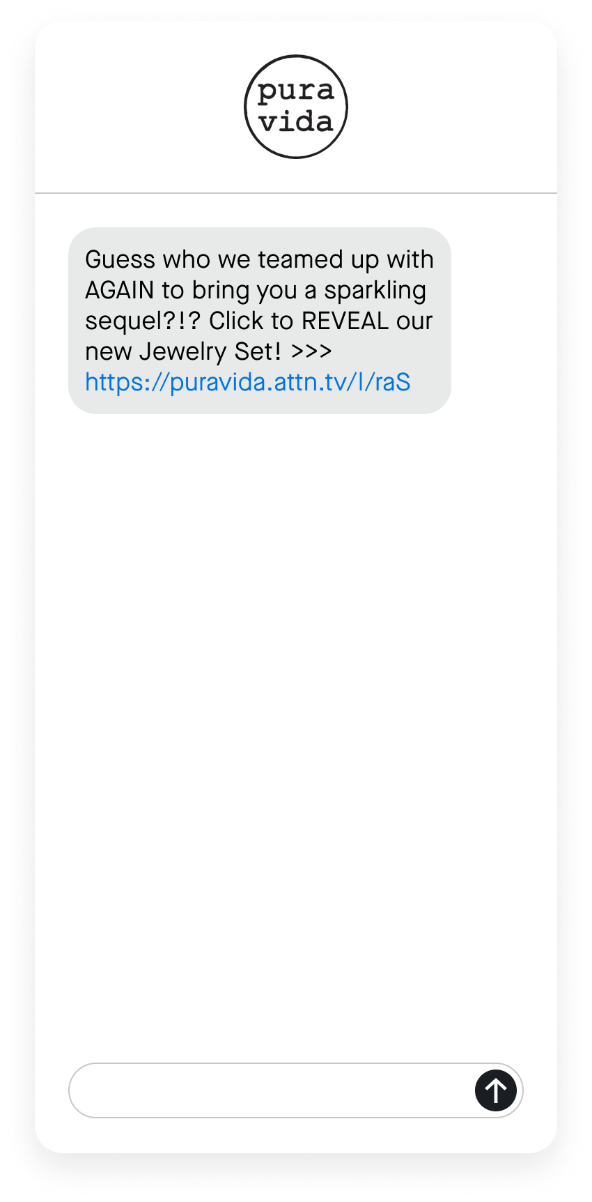 Pura Vida Bracelets encouraged engagement from their SMS subscribers with a mystery collaboration campaign. They teased the launch with a few details on the new product (“sparkling sequel”), but saved the final reveal for people who clicked the link within their message. This strategy drove traffic to the website, prompting subscribers to shop the new collaboration and browse other products.