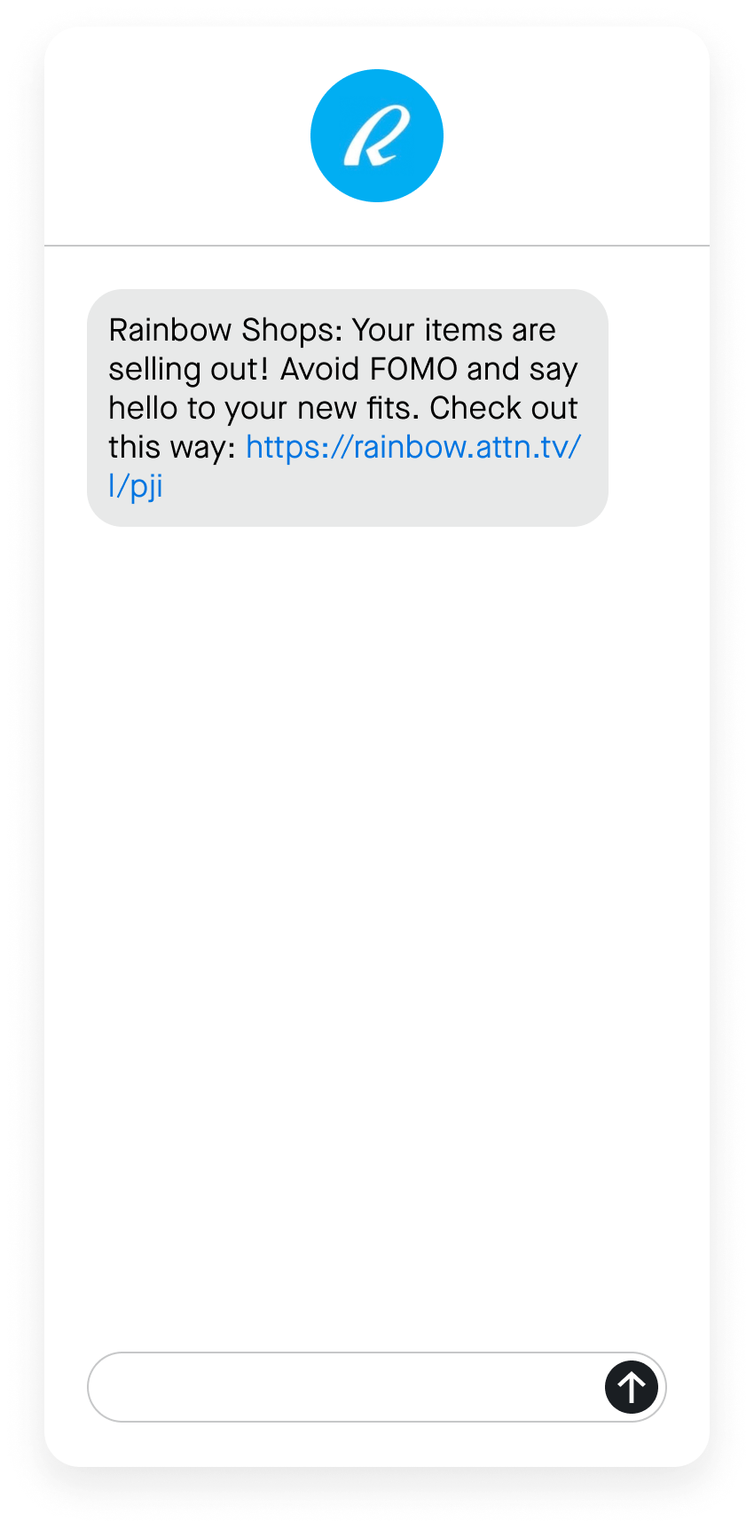 Rainbow makes sure their SMS subscribers don’t miss the chance to buy a “new fit” with triggered low inventory alerts. When a product a subscriber has viewed or added to their cart is selling out fast (e.g., the inventory level drops below a certain threshold), they get a text message letting them know to shop now to avoid FOMO.