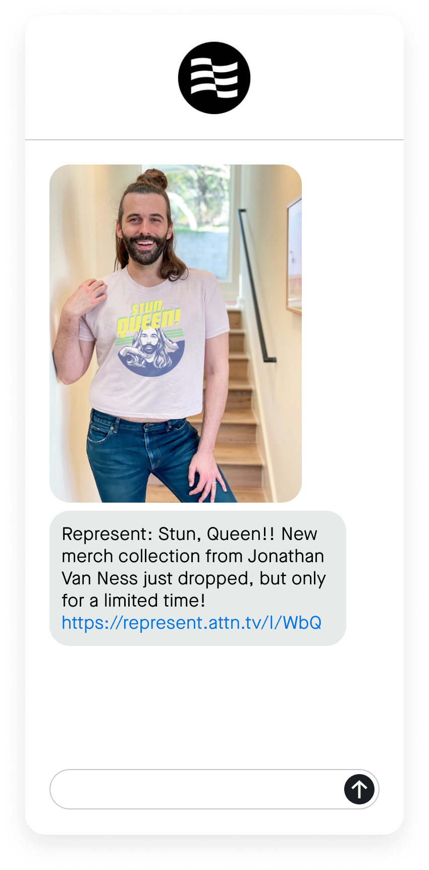 Represent used text messaging to promote a new merch collection from Jonathan Van Ness (know as JVN). They infused the message with JVN’s signature voice (“Stun, Queen!!”) and let subscribers know to shop now since the collection would only be available for a limited time.
