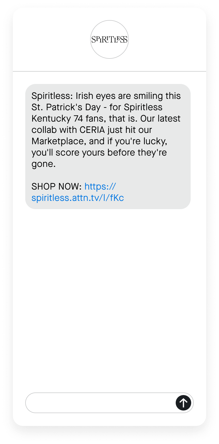 Spiritless celebrated St. Patrick’s Day with their SMS subscribers by announcing their collaboration with non-alcoholic brewery CEIRA. The nod to the holiday (“Irish eyes are smiling…”) and reference to their bestselling Kentucky 74 spirit stood out to the engaged customers. The brand’s limited-time messaging (“before they’re gone”) drove subscribers to immediately act on this specialty product.