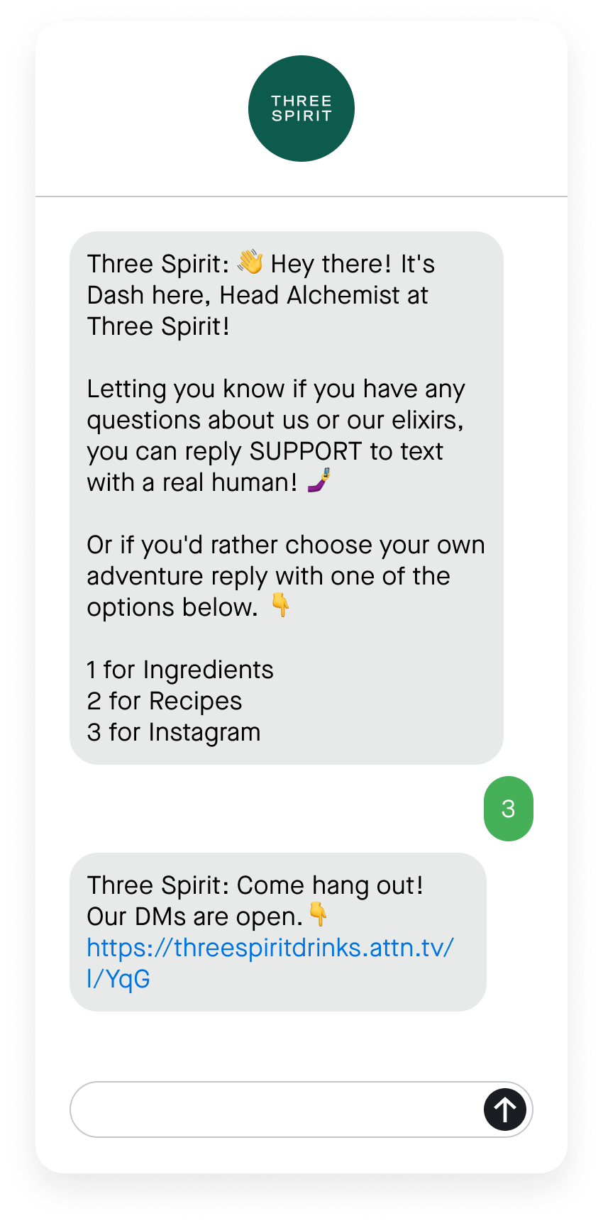 Three Spirit introduces new subscribers to their SMS channel’s many perks in their welcome journey. The brand uses Two-Way Journeys™ to let new subscribers customize their SMS experience by replying with a keyword aligned with their interest—like product education, social media, and 1:1 support with Attentive Concierge™.