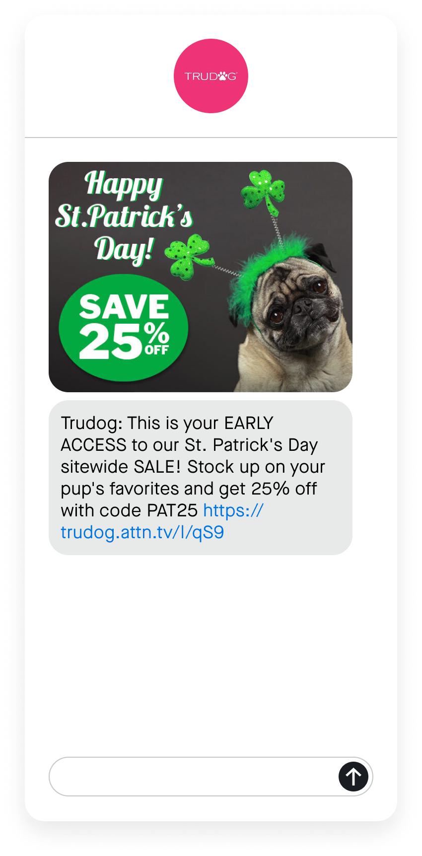 A few days before St. Patrick’s Day, TruDog gave their SMS subscribers early access to their sitewide sale. The text included an image highlighting the sale’s details with an adorable seasonal twist. Giving SMS subscribers exclusive access made shoppers feel special, building urgency to instantly click the direct link and “stock up.”