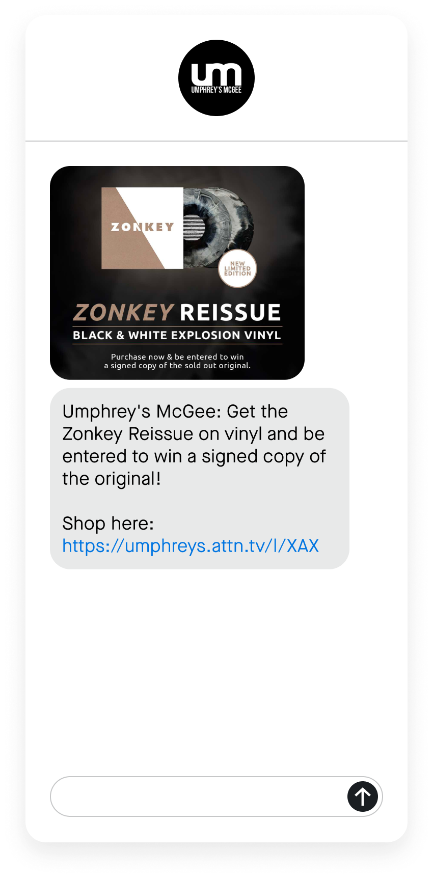 American jam band Umphrey’s McGee promoted their Zonkey reissue to their fans via text messaging. In addition to ordering the vinyl, Umphrey’s McGee also let subscribers know that they’d be entered to win a signed copy of the original. They also included an eye-catching graphic of the vinyl and a direct link to shop.