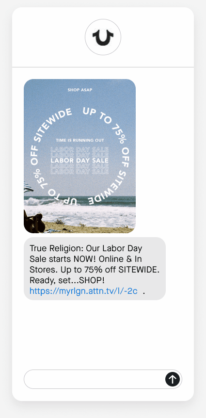 True Religion drove online and in-store revenue with their SMS Labor Day campaign. The brand doubled down on the sitewide sale’s limited availability, creating a sense of urgency in both the text and seasonal GIF. They ended with a playful CTA (“Ready, set...SHOP!”) and a direct link for subscribers to instantly take advantage of the limited-time sale.