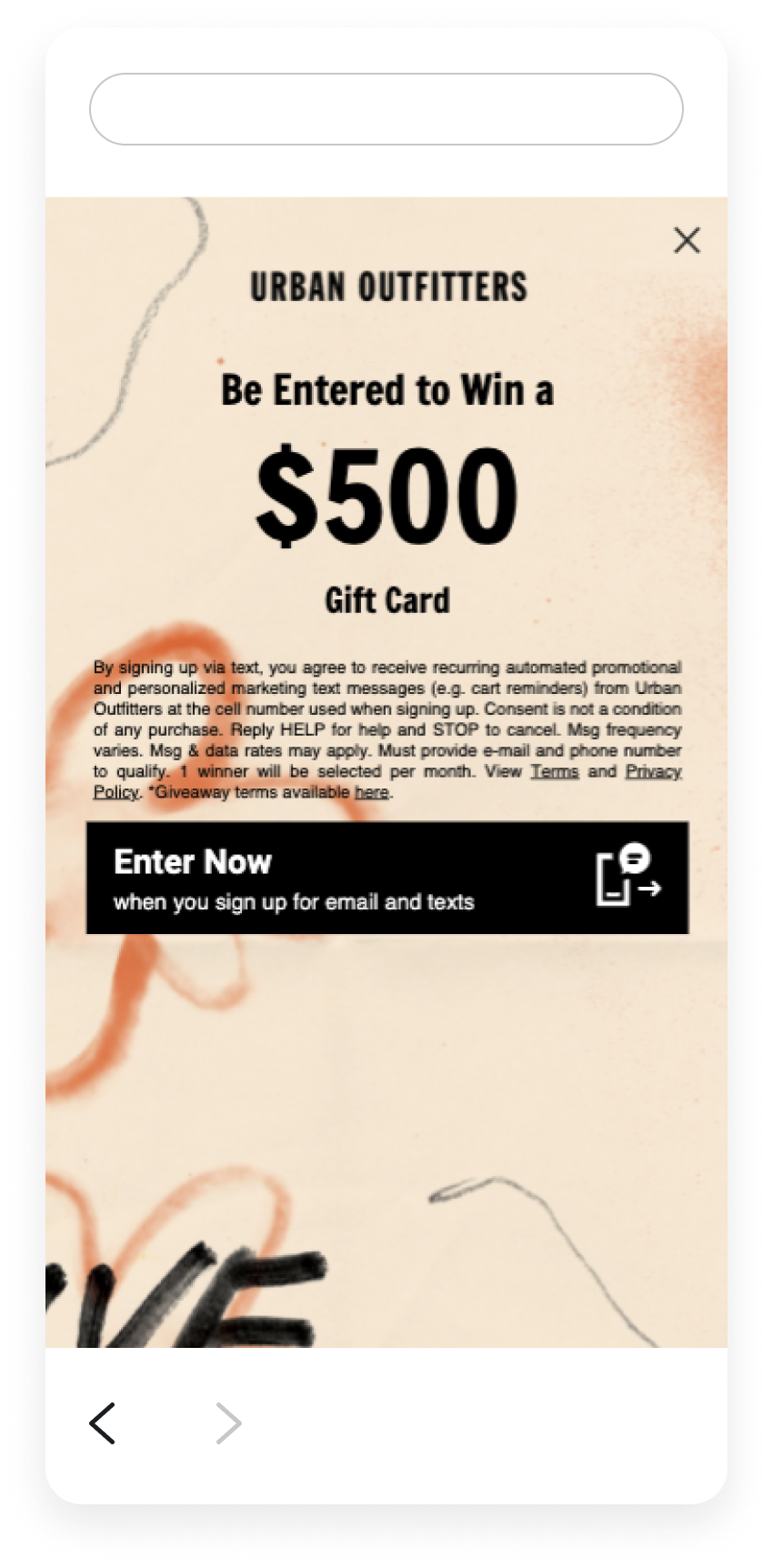 Urban Outfitters drives SMS list opt-ins with Attentive’s “two-tap” sign-up flow on their mobile website. Providing new subscribers with the chance to win $500 is an exciting incentive to prompt them to sign-up without offering a direct discount.